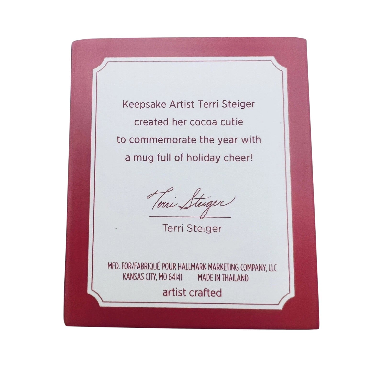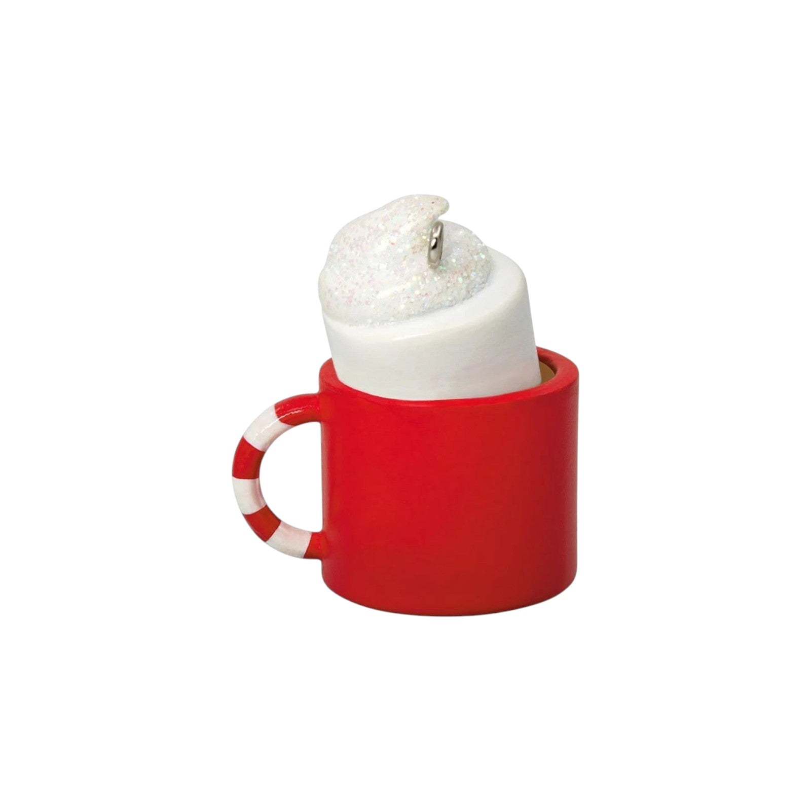 Warm up your holiday decor with the 2018 Cocoa Cutie miniature ornament from Hallmark's Snowmen series. This adorable piece features a smiling marshmallow peeking out of a festive red mug adorned with a candy cane-striped handle and topped with whipped cream. Designed by artist Terri Steiger, this ornament is a Keepsake Ornament Club (KOC) member exclusive, making it a must-have for collectors. Dated 2018, it measures approximately 1" W x 1.15" H x 0.82" D and comes in its original packaging, ensuring its pristine condition.