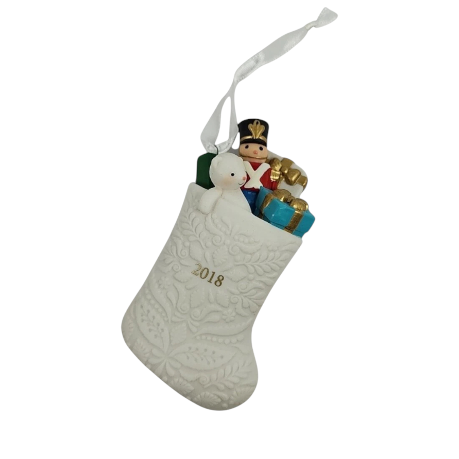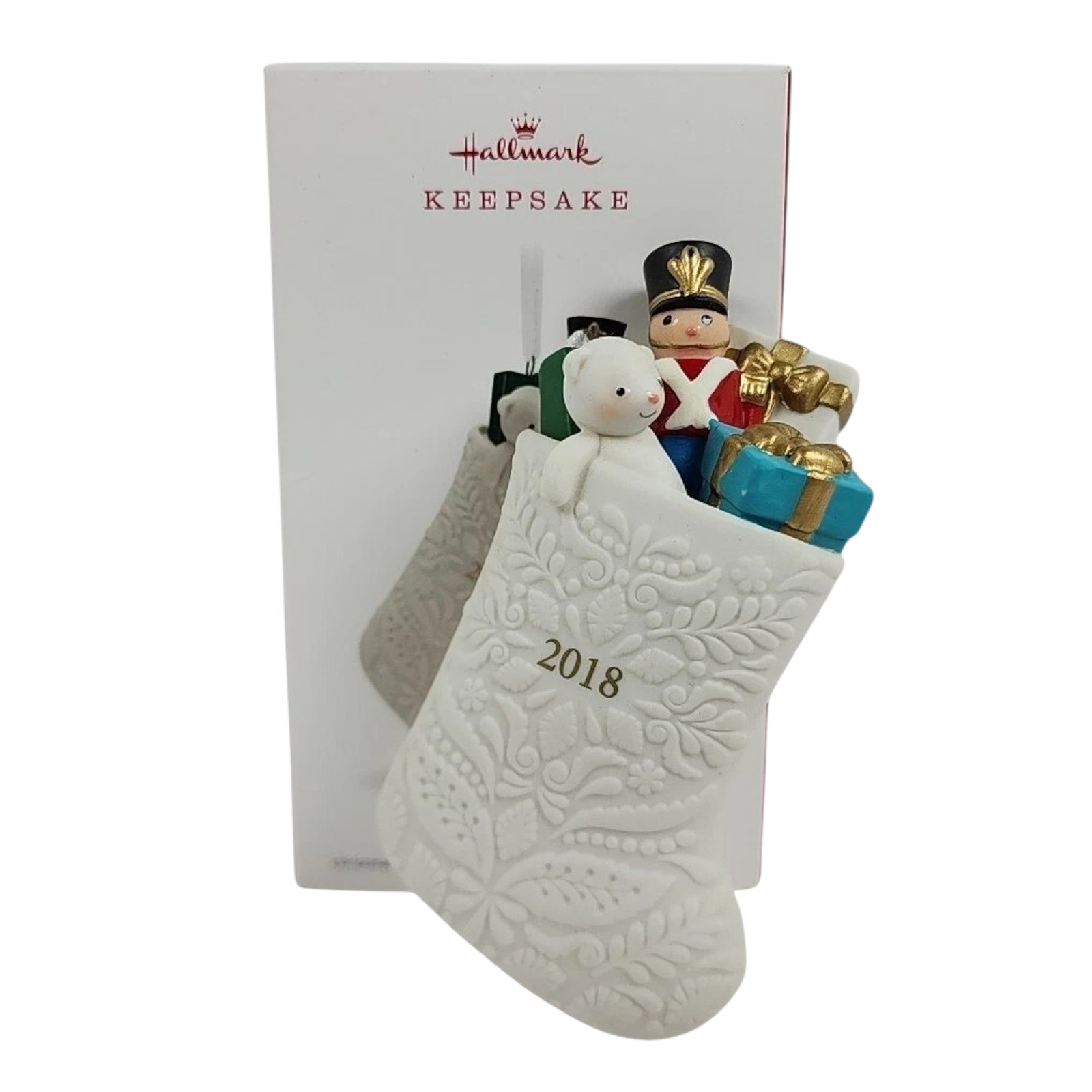 Bring a classic holiday moment to your tree with the 2018 “Filled With Fun!” Keepsake ornament. This charming piece depicts a white porcelain Christmas stocking overflowing with festive delights — including a cuddly teddy bear, a toy soldier in red and blue uniform, and wrapped presents with bright gold bows. The inscription reads “2018” to commemorate the year, making it a special addition for collectors and holiday décor lovers alike.