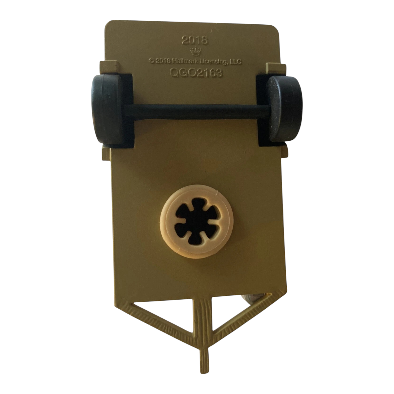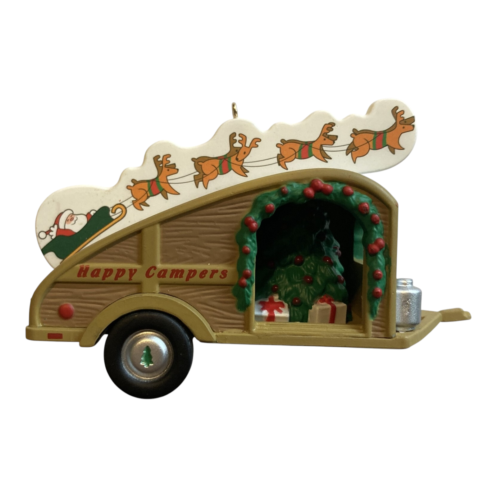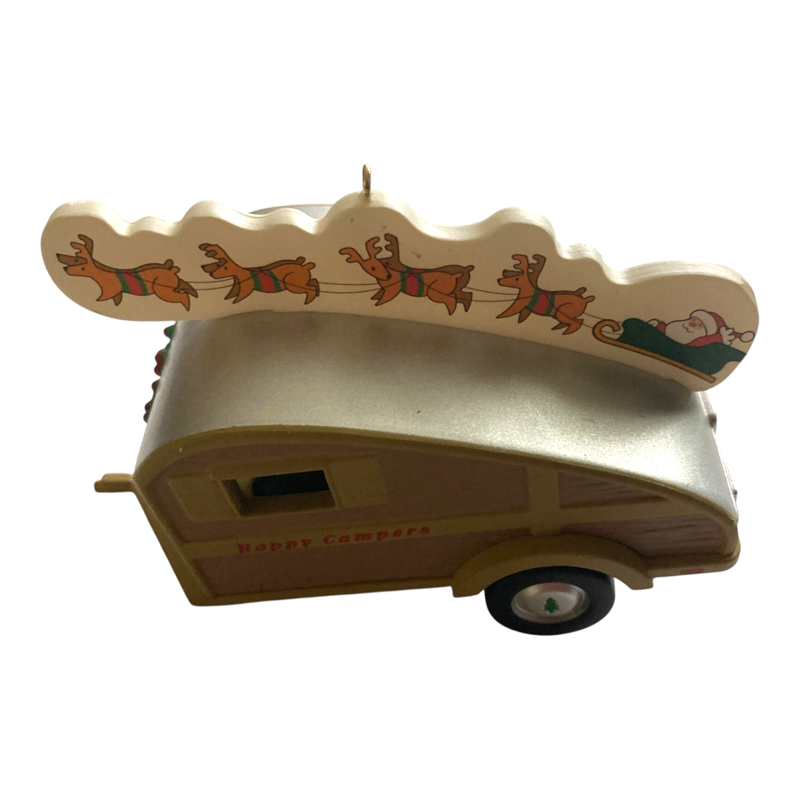 This cheerful 2018 ornament from the Hallmark Keepsake collection showcases a festive travel-trailer scene featuring Santa and his reindeer perched atop a colorful camper decorated for the holiday season. Designed by artists Anita Marra Rogers and Robert Chad, it offers a playful nod to the “happy campers” spirit—with details like a rubber grommet that allows insertion of a miniature tree-light bulb for illumination. The design blends outdoor adventure and holiday cheer, making it ideal for camping enthusiasts, RV-theme décor, or anyone adding a whimsical touch to their tree.