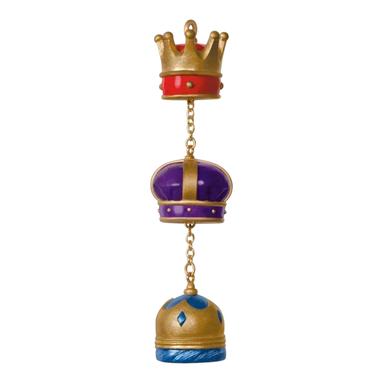 Celebrate the timeless story of the Three Kings with this beautifully crafted ornament. Featuring the iconic figures of Melchior, Gaspar, and Balthazar, each adorned in rich robes and crowns, this piece captures the essence of the Nativity scene. The ornament comes in its original box with a decorative tag, making it a perfect gift or collector's item. No batteries or cords are required; it's ready to display.