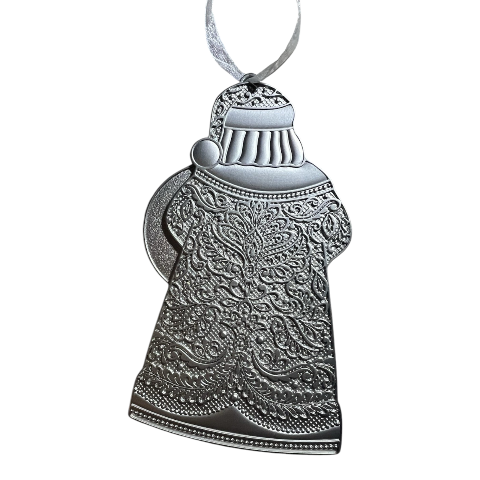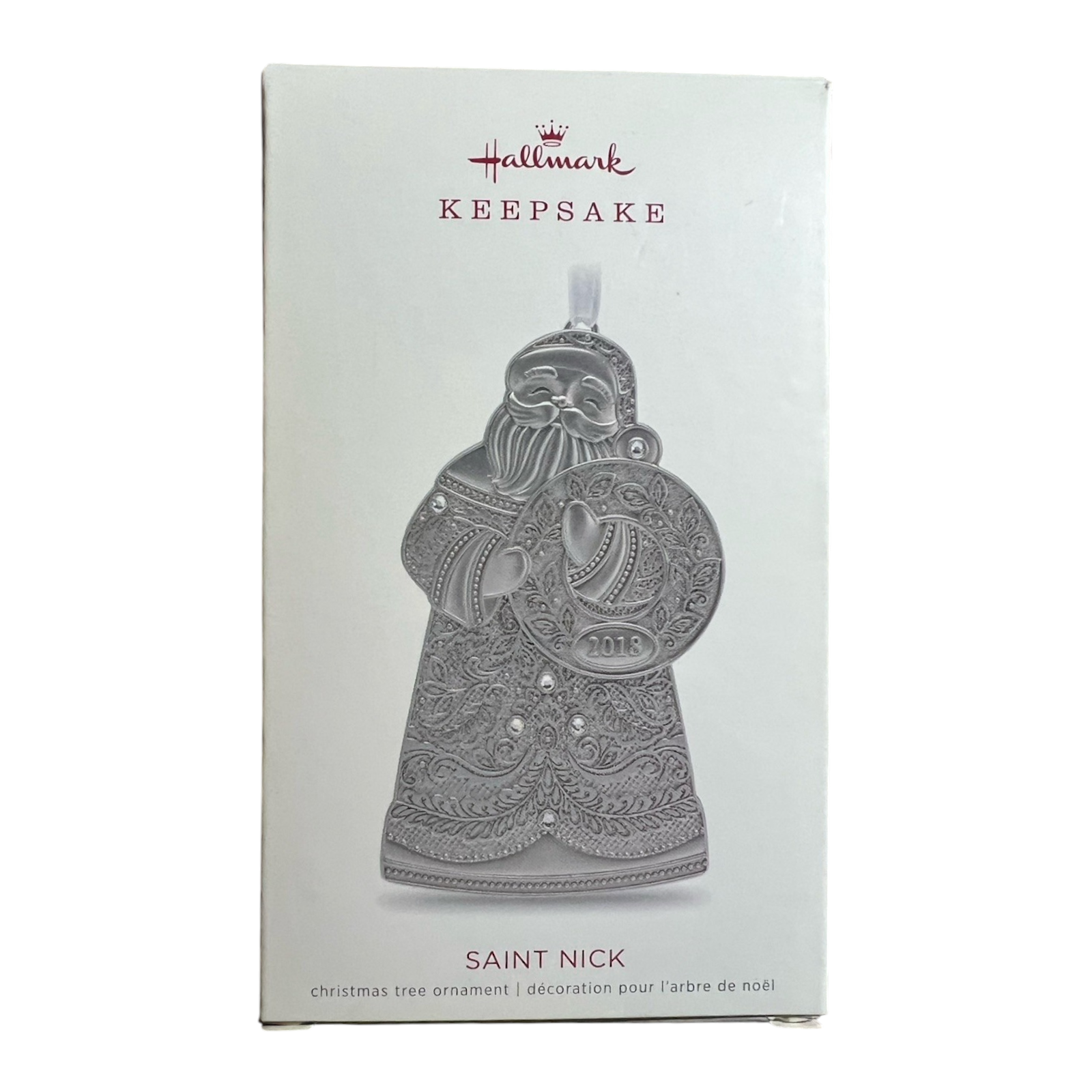 This elegant 2018 ornament from the Hallmark Keepsake collection features a refined metal-Santa design titled Saint Nick. Crafted from lead-free metal, it showcases embossed detailing, gemstone accents, and the year “2018” held within a wreath by Santa himself. The richly textured finish and metallic tones make it both festive and collector-worthy. Designed by artist Terri Steiger, this piece offers sophisticated holiday décor and makes a memorable gift for Santa-themed collectors.