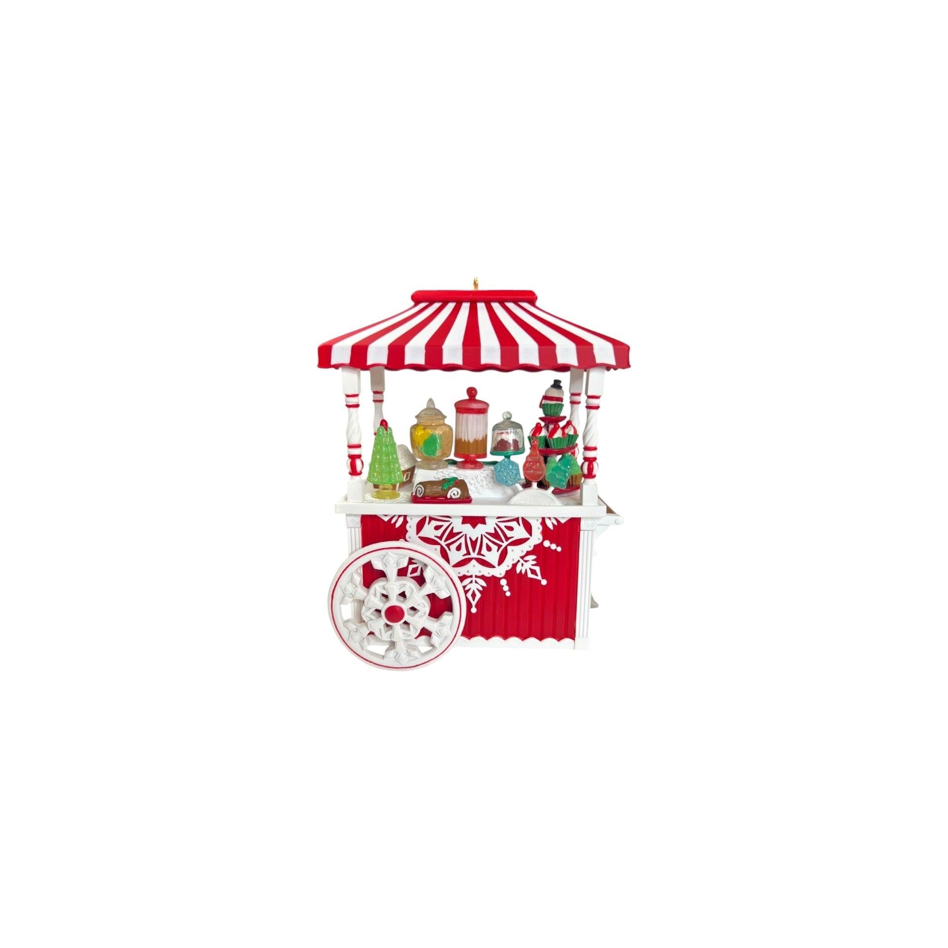 Delight in whimsical holiday charm with Santa’s Sweet Treat Cart (2018), an artist-exclusive Hallmark Keepsake Ornament designed as a festive cart overflowing with candy, cookies, gingerbread, pretzels, and holiday sweets—perfect for any Christmas tree display. This event exclusive piece was released as a companion to the 2018 Club Member Sweet Santa and showcases the collaborative work of multiple Hallmark Keepsake Studio artists. It is typically found new in original box, ready to adorn your tree or become part of a collector’s showcase. No batteries, cords, or light strings are required—just hang it and enjoy.