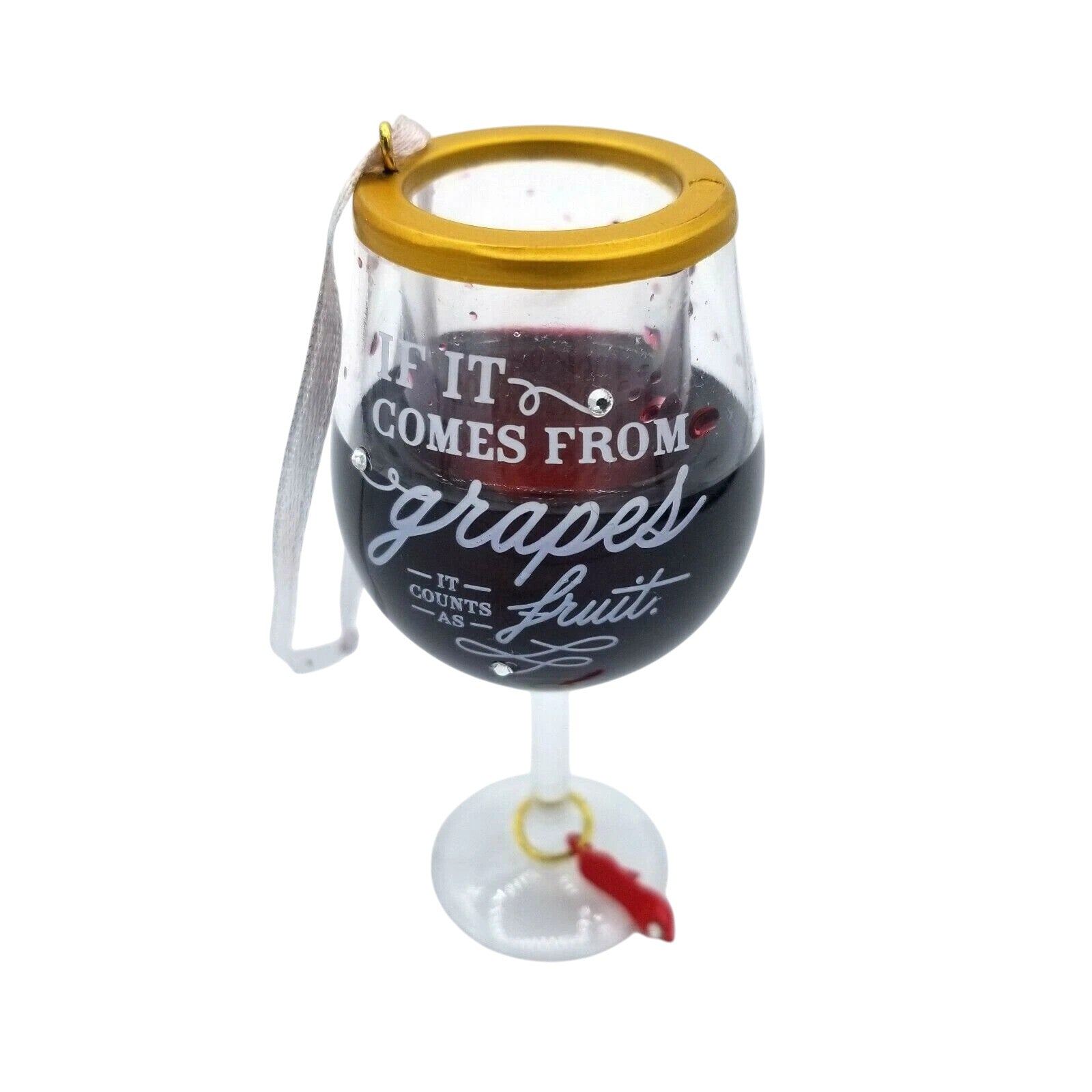 Celebrate the joy of wine with the 2018 Time for Wine Keepsake Ornament. This playful piece features a red wine glass with a moving liquid effect and a red high-heeled shoe wine charm on the stem. Emblazoned with the humorous phrase, "If it comes from grapes, it counts as fruit," this ornament is perfect for wine enthusiasts and adds a touch of fun to your holiday decor. Crafted from durable plastic, it measures approximately 1.65" W x 3.5" H x 1.65" D and arrives in its original packaging.
