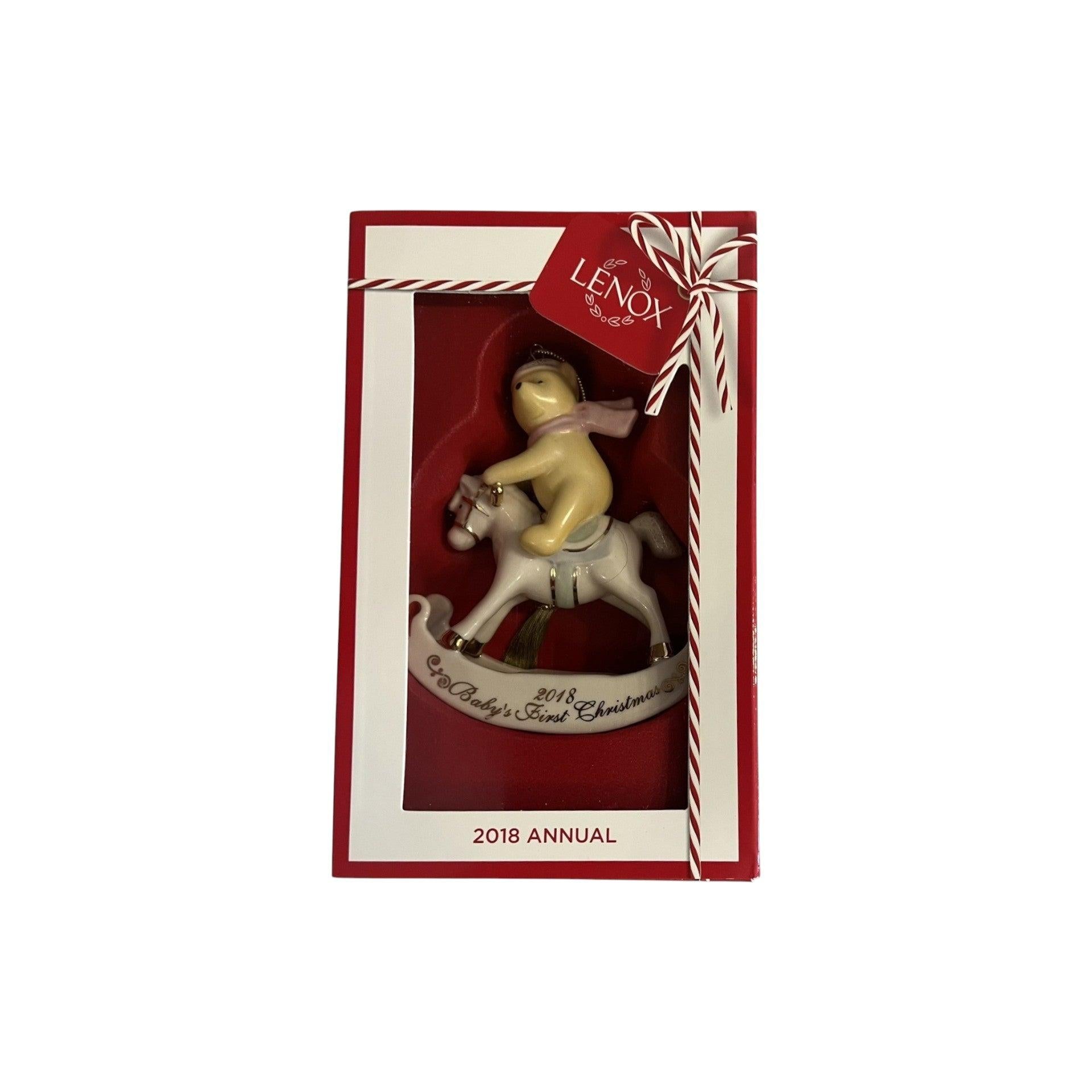 This sweet Lenox Disney ornament celebrates Baby’s First Christmas with Winnie the Pooh, capturing a tender holiday moment filled with warmth and charm. Crafted in Lenox’s signature ivory porcelain with gentle hand-painted accents, Pooh is featured in a soft, baby-themed design that commemorates a cherished milestone. Elegant yet playful, this ornament makes a meaningful keepsake for parents, grandparents, and Disney fans welcoming a new baby during the holiday season. The ornament comes packaged in its original Lenox box.