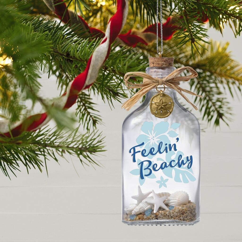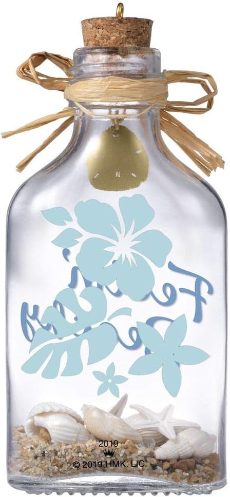 Bring a breath of seaside peace to your holiday décor with this lighthearted 2019 Feelin’ Beachy Keepsake ornament. Featuring a charming glass bottle filled with real sand and seashells, topped with cork and raffia bow, and finished with a sand-dollar charm, this ornament is perfect for anyone who treasures the ocean breeze. Includes the original gift box with ribbon and tag—hang straight from the bottle for immediate vacation vibes. No batteries, cords, or lights required.