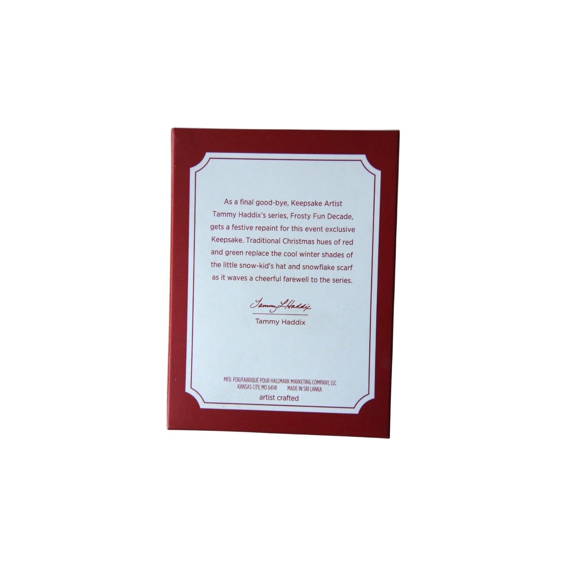 This special Hallmark Event Exclusive ornament celebrates a decade of the beloved Frosty Fun series, featuring one of Hallmark’s iconic snowmen in a festive, winter-ready pose. Known for its playful charm and collectible appeal, this ornament highlights the cheerful personality and whimsical design that Frosty Fun fans look forward to each year. As an event-exclusive release, it holds added significance for collectors. The ornament comes packaged in its original Hallmark Keepsake box and includes the original hanging string and tag. It is a static ornament and does not require batteries, cords, motion, sound, or light strings.