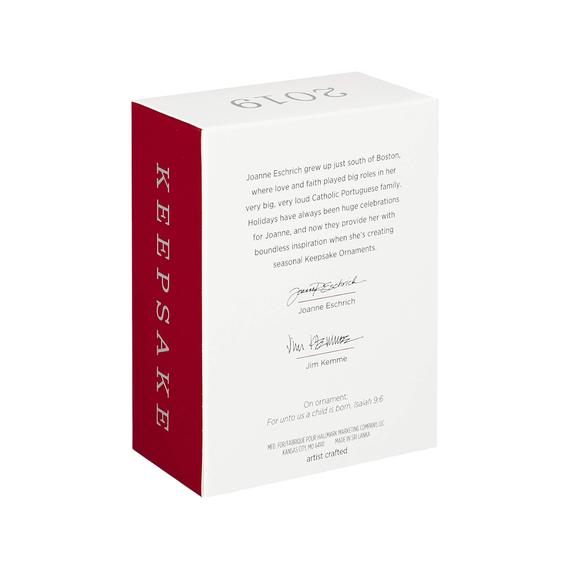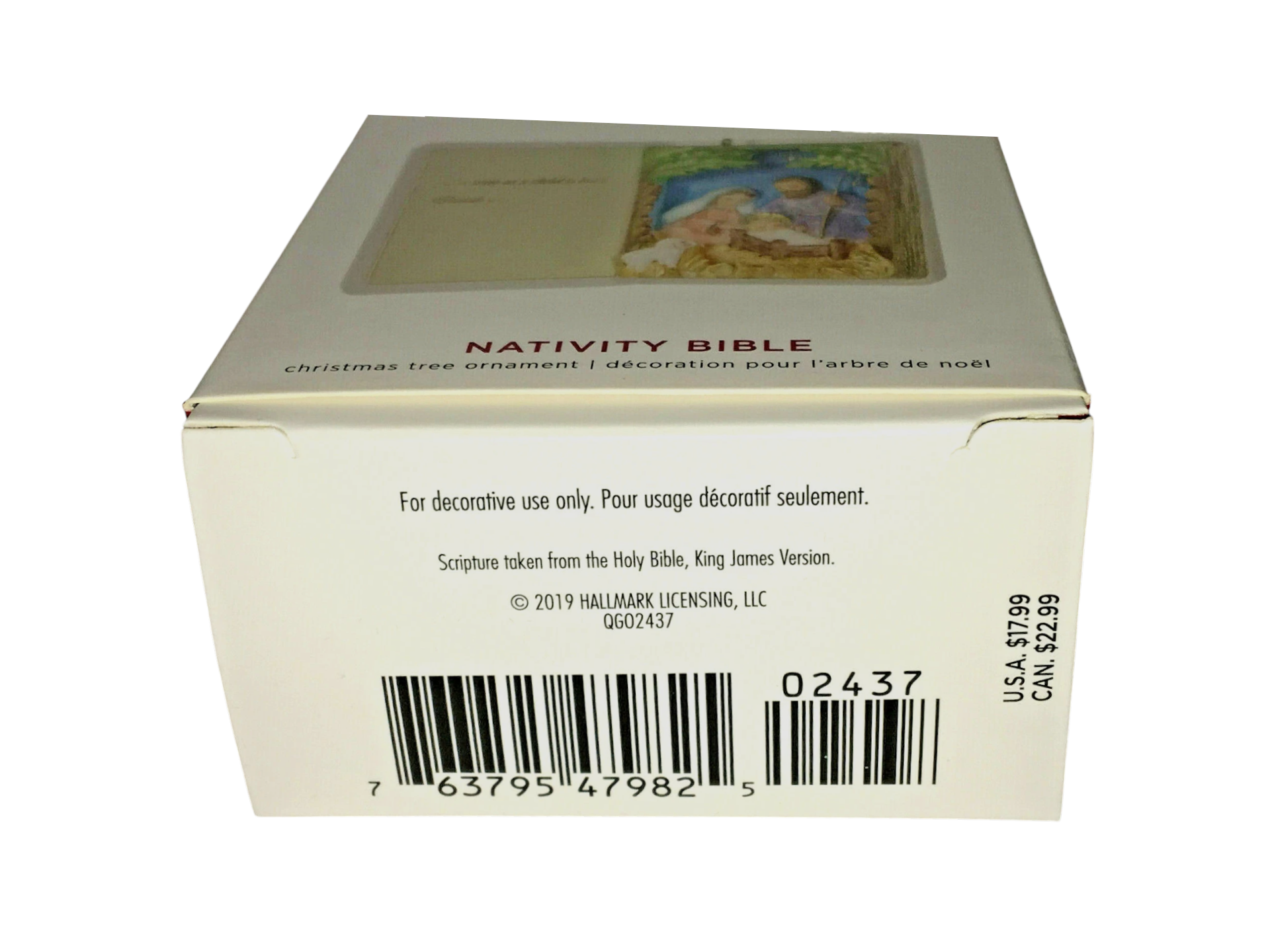 Celebrate the true meaning of Christmas with this 2019 Hallmark Keepsake ornament titled Nativity Bible. Shaped like an open holy book, the ornament features the scripture verse “For unto us a child is born. Isaiah 9:6” on the left page and a beautifully sculpted manger scene with Mary, Joseph, the Baby Jesus and a lamb on the right page. The Star of Bethlehem is represented by a sparkling gemstone set in the night sky above the stable—accented with shimmering gold lettering for a rich, reverent look. Dated 2019, the piece arrives in its original box with gift-tag card intact and makes an elegant addition to any tree, especially for collectors of religious or Nativity-themed ornaments.