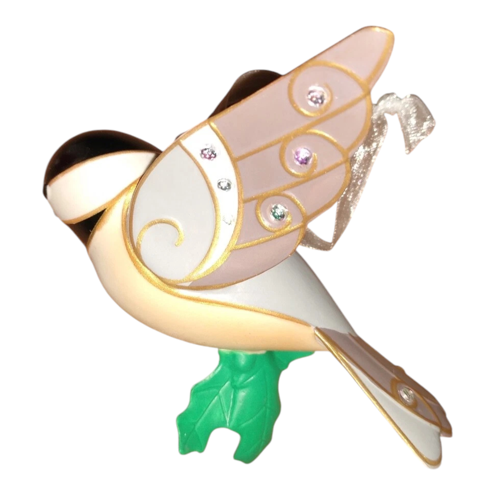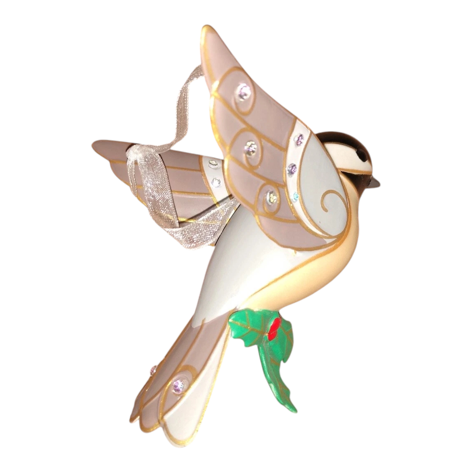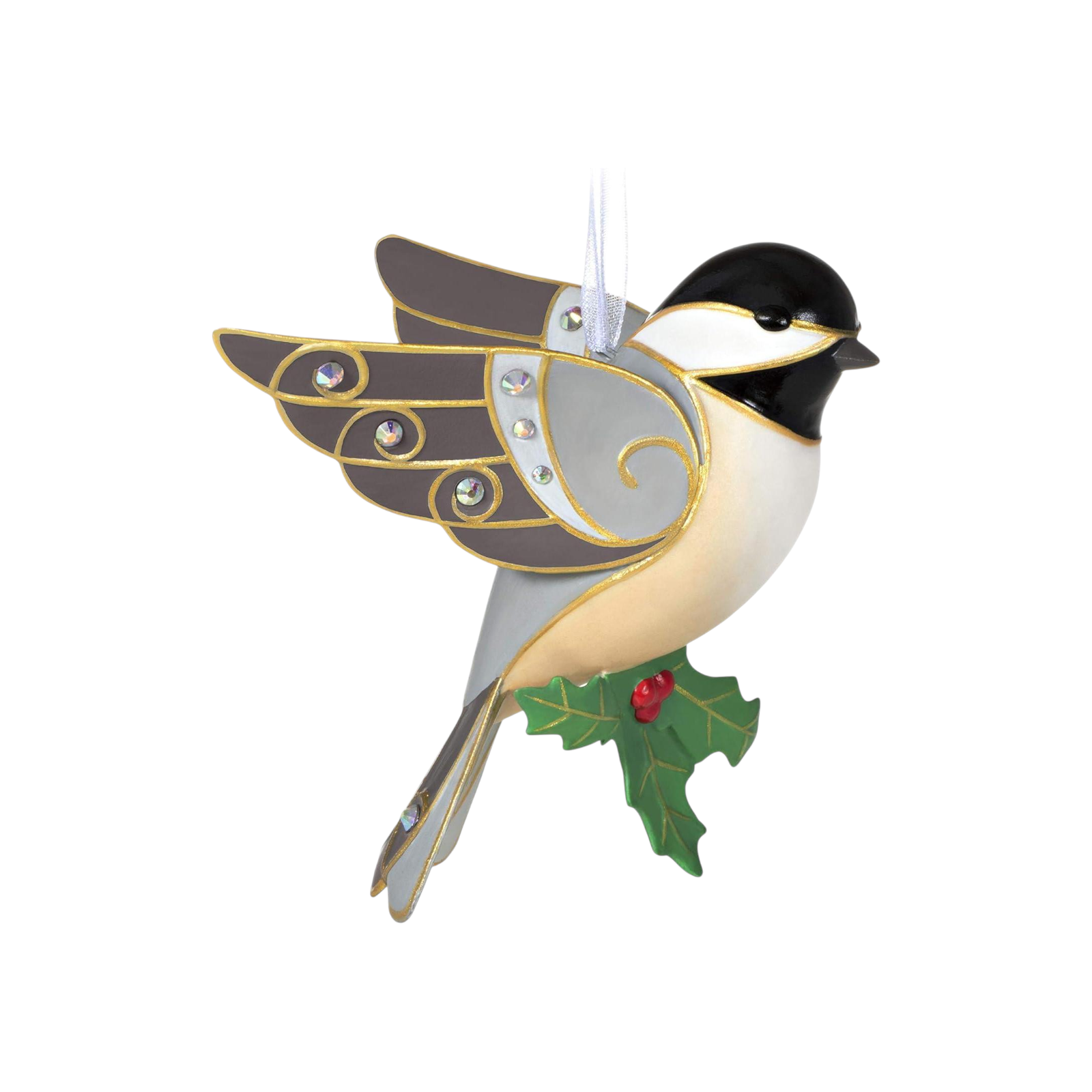 Embrace the charm of winter with the 2020 Beautiful Black-Capped Chickadee ornament from Hallmark's Beauty of Birds series. Crafted from premium porcelain, this exquisite piece features a delicately perched chickadee adorned with gem accents and nestled on holly leaves with red berries. Designed by Edythe Kegrize, it measures approximately 2.69" W x 3.03" H x 3.09" D. The ornament comes in its original packaging, ensuring safe storage and making it an ideal gift for bird enthusiasts and collectors.