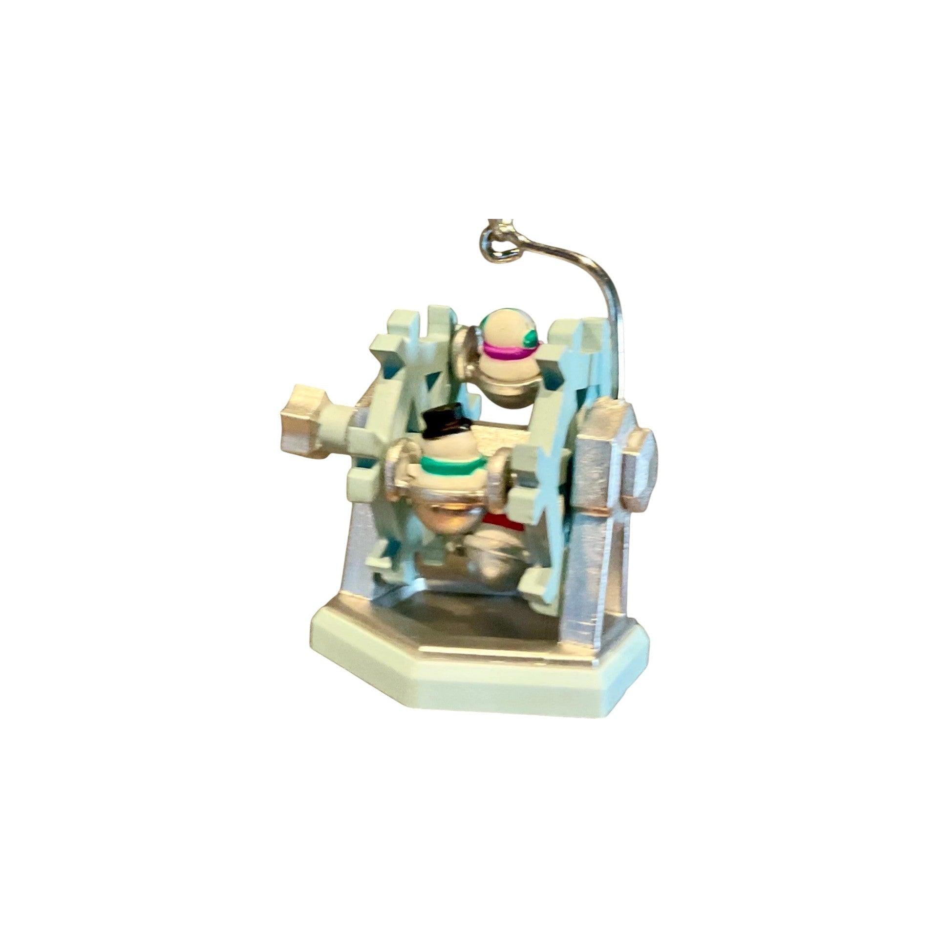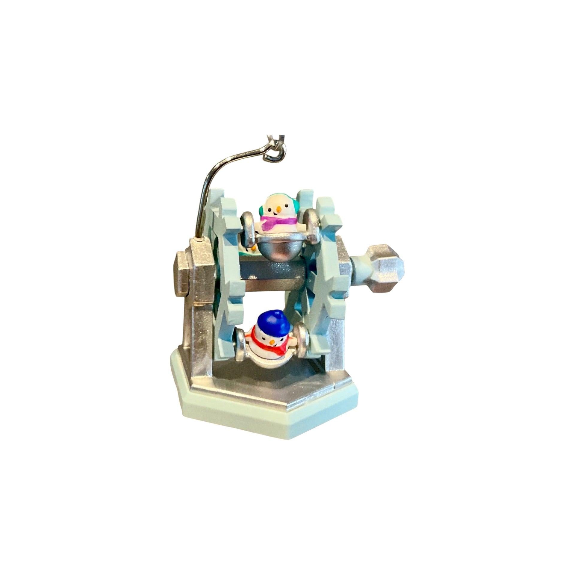 This delightful Hallmark miniature ornament features a whimsical Ferris wheel filled with cheerful snowmen enjoying a festive winter ride. Designed with charming details and a playful circular layout, the ornament captures the joy and wonder of holiday amusement parks in a petite format. Its miniature size makes it perfect for small trees, garlands, or adding visual interest to a snowman-themed display. The ornament comes packaged in its original Hallmark Keepsake box with hang tag. It does not require batteries, cords, or light strings for display.