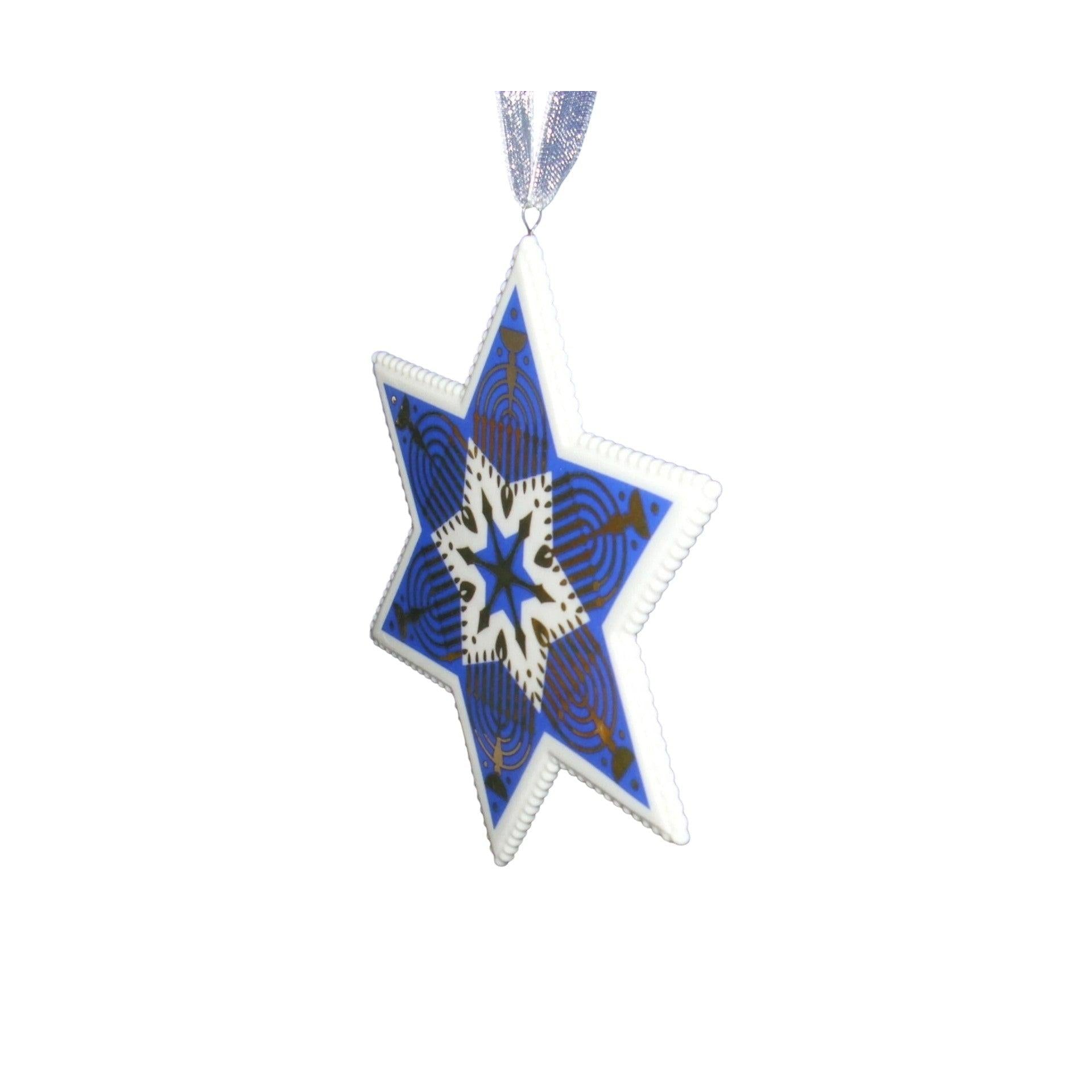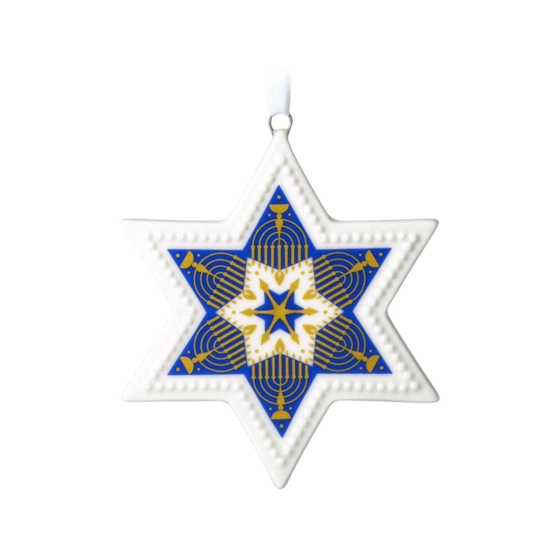 Celebrate the Festival of Lights with this 2020 Hallmark “Hanukkah Blessings” ornament, designed as a blue-and-white Star of David filled with gold menorah patterns and delicate embossed-dot detailing for a rich, textured look. Crafted in lead-free porcelain, it’s a meaningful seasonal symbol that works beautifully on a Hanukkah-themed tree, winter branches, or a holiday display.