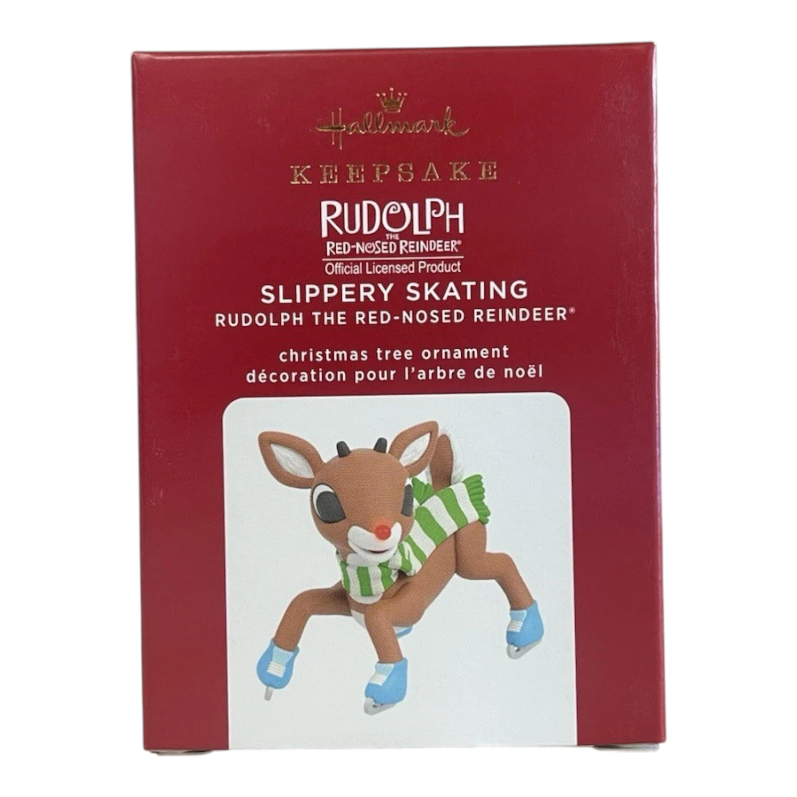 Celebrate the magic of the holidays with the 2020 Slippery Skating ornament, starring Rudolph the Red-Nosed Reindeer. This delightful ornament captures Rudolph slipping and sliding in an adorable ice-skating pose, complete with a striped scarf and cheerful smile. Perfect for fans of the classic TV special, it comes with the original box and collectible hang tag. No batteries or cords required.