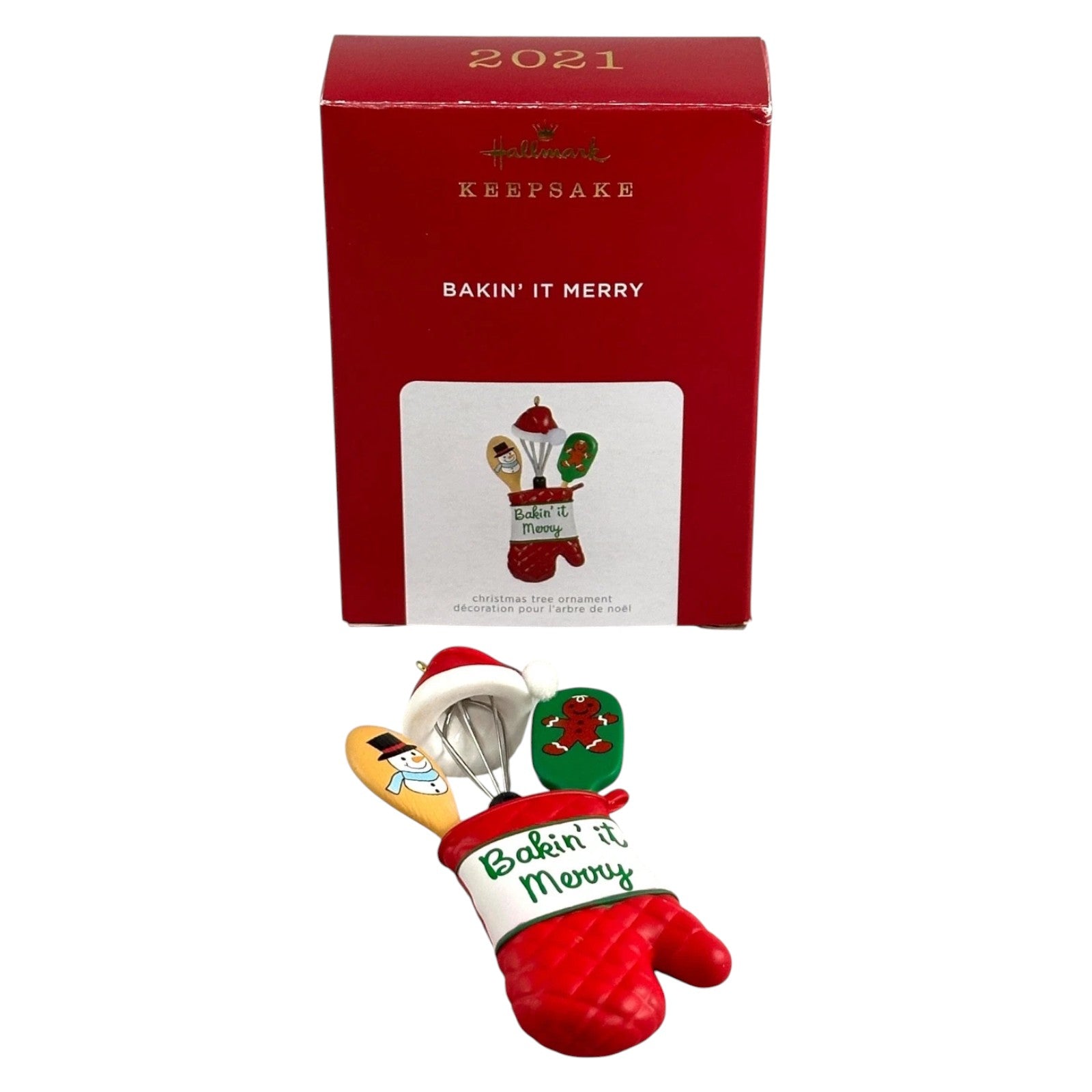 Celebrate holiday baking and kitchen cheer with the charming 2021 ornament Hallmark Keepsake “Bakin’ It Merry” (SKU: QGO2352). Designed by Debra Nielsen, this piece features a sculpted oven mitt textured like quilted fabric, and inside you'll find three festive baking utensils—a snowman-shaped spoon, a gingerbread-man spatula, and a whisk topped with a Santa hat.