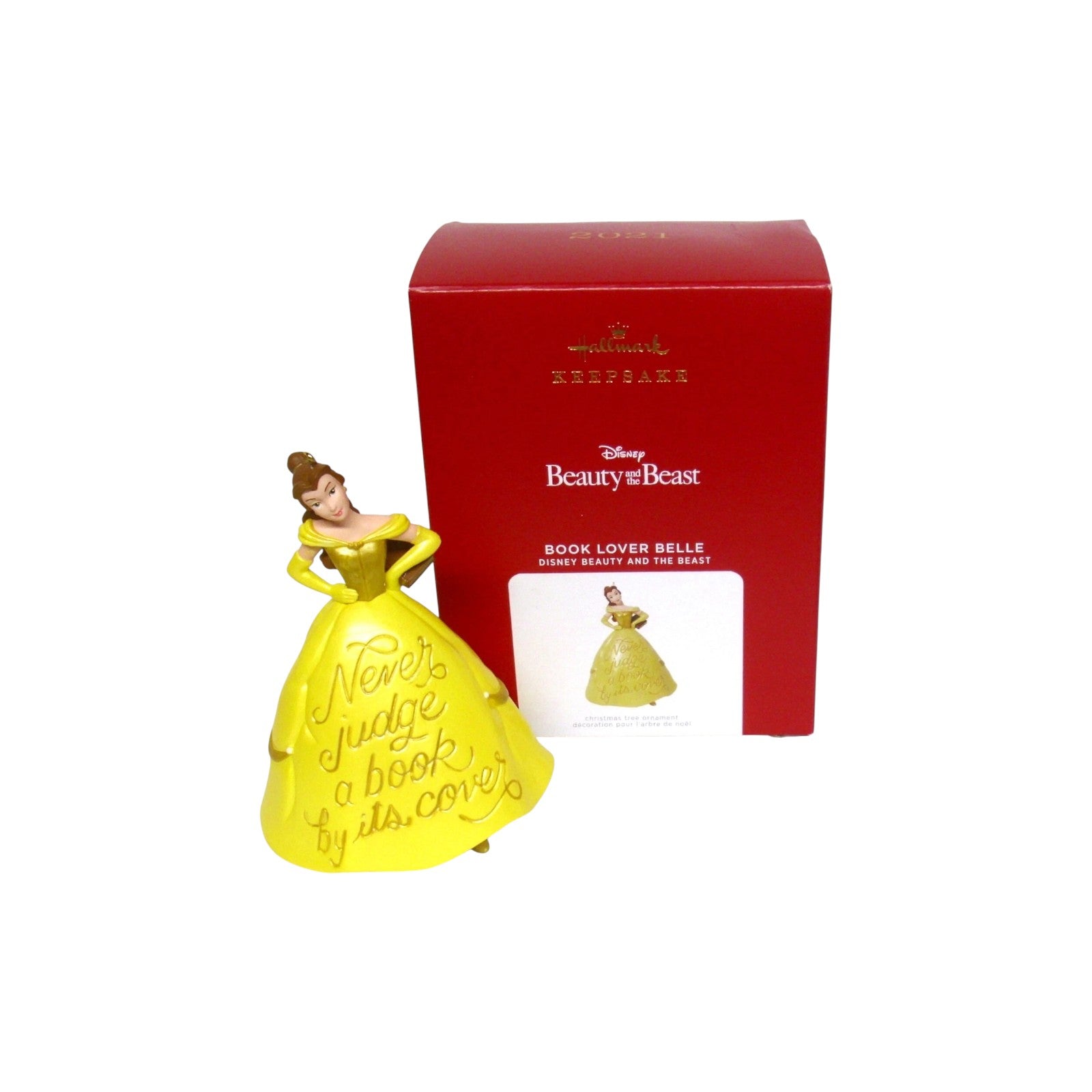 Enchant your holiday tree with the elegant 2021 Book Lover Belle, inspired by Beauty and the Beast. This delightful ornament features Belle in her iconic yellow ball gown, holding a book tucked under her arm—and the skirt bears the whimsical script: “Never judge a book by its cover.” Packaged in its original red Keepsake presentation box with hanging tag and 2021 copyright date. No batteries, cords, or light strings needed—this graceful keepsake is purely decorative and ready to hang.