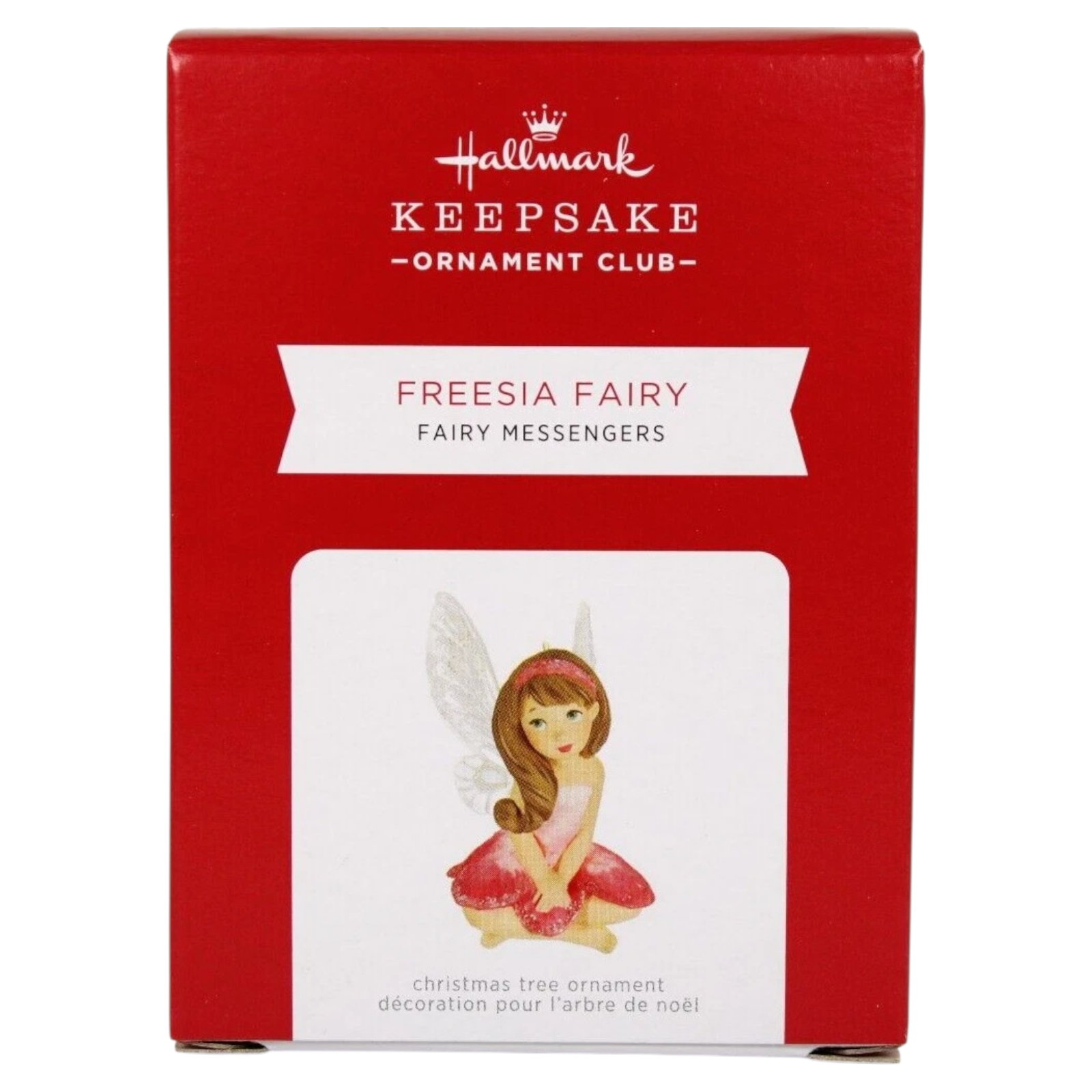 This special-edition 2021 ornament from the Hallmark Keepsake “Fairy Messengers” collection features Freesia Fairy—depicted with silken brown hair, large green eyes, and shimmering iridescent wings, dressed in a petal-style pink dress adorned with glitter accents. What makes this version particularly collectible is that it is a Club Event Exclusive Repaint—only available through the Keepsake Ornament Club, not in retail stores.