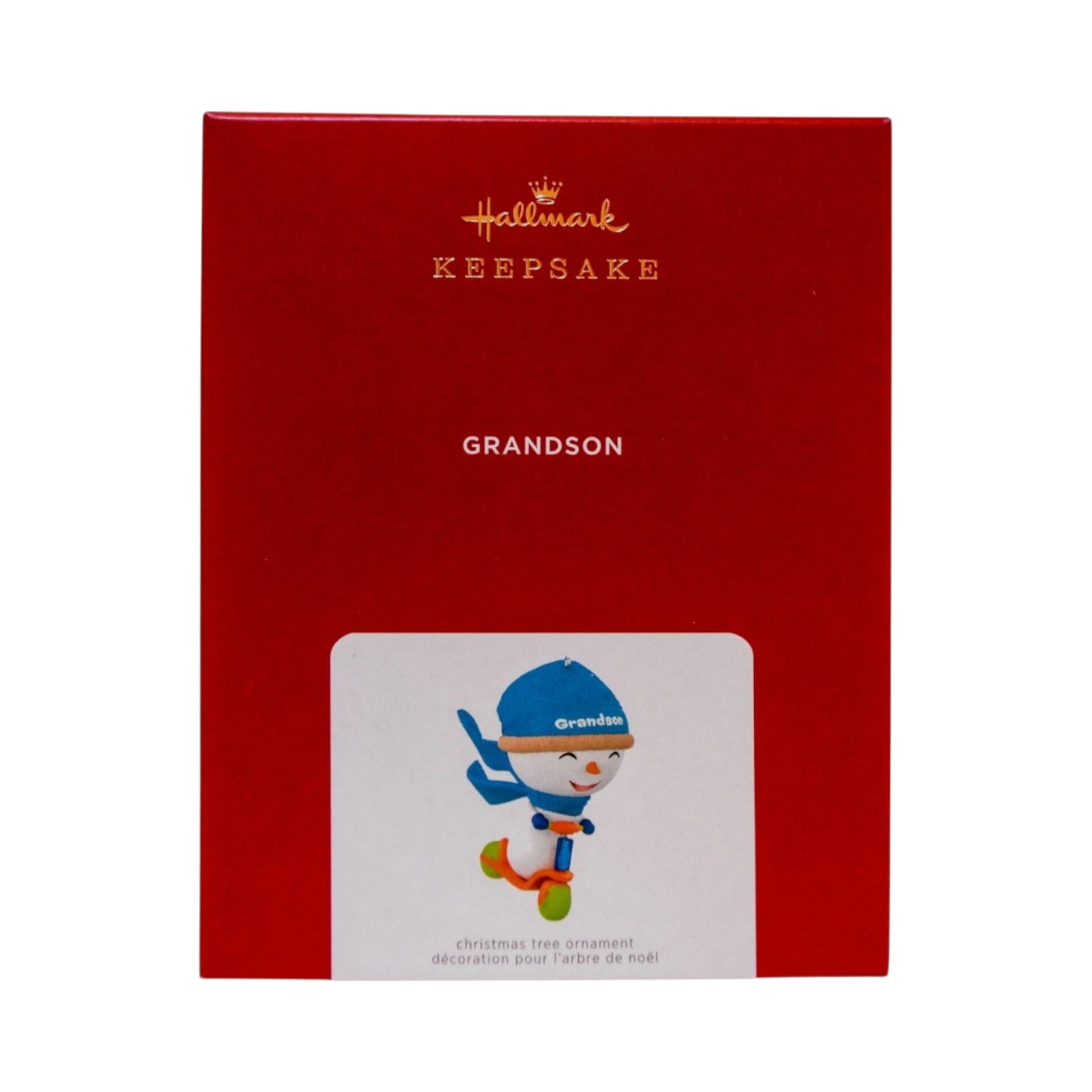 Celebrate your grandson with this adorable 2021 Grandson snowman ornament, featuring a smiling snowman “kid” bundled in a bright blue knit-style hat and scarf as he zips along on an orange scooter with green wheels. The design is year-dated 2021 and includes “Grandson” printed on the hat, making it a sweet, memory-making keepsake for that year’s Christmas. Comes packaged in the original Hallmark box (when new) for easy gifting and safe storage. No batteries, cords, or light strings are required.