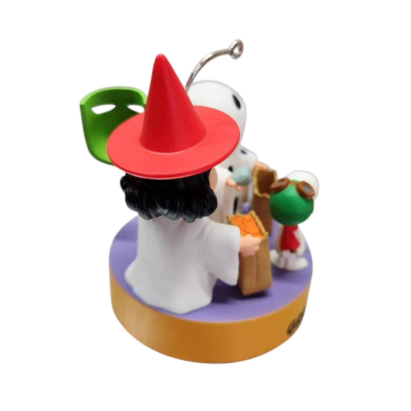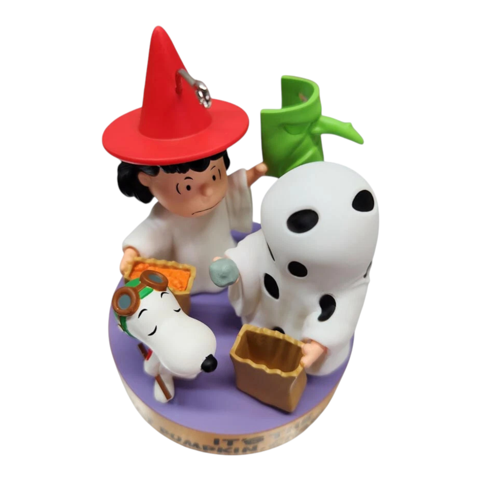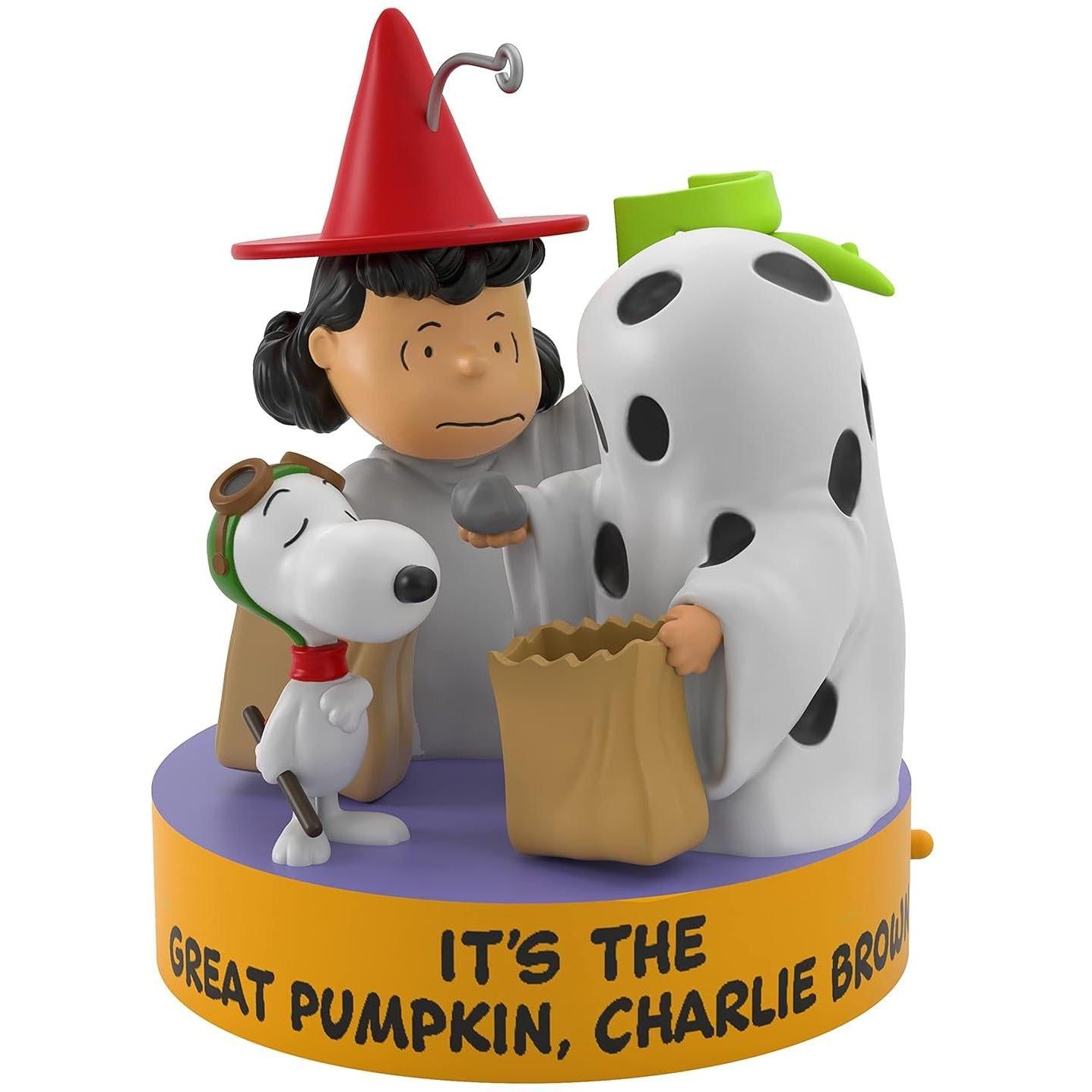 Celebrate Charlie Brown’s classic Halloween melancholy with this charming keepsake featuring Snoopy as the Flying Ace, Lucy in her witch's hat, and Charlie Brown dressed as a ghost, holding a paper bag of… rocks! One press of the button triggers authentic dialogue from the iconic “I got a rock!” scene, and the ornament is ready to hang—with batteries already included. Packaged in its original box and tags, it’s a nostalgic delight for any Peanuts fan.