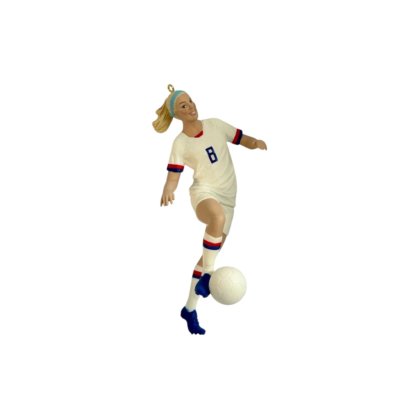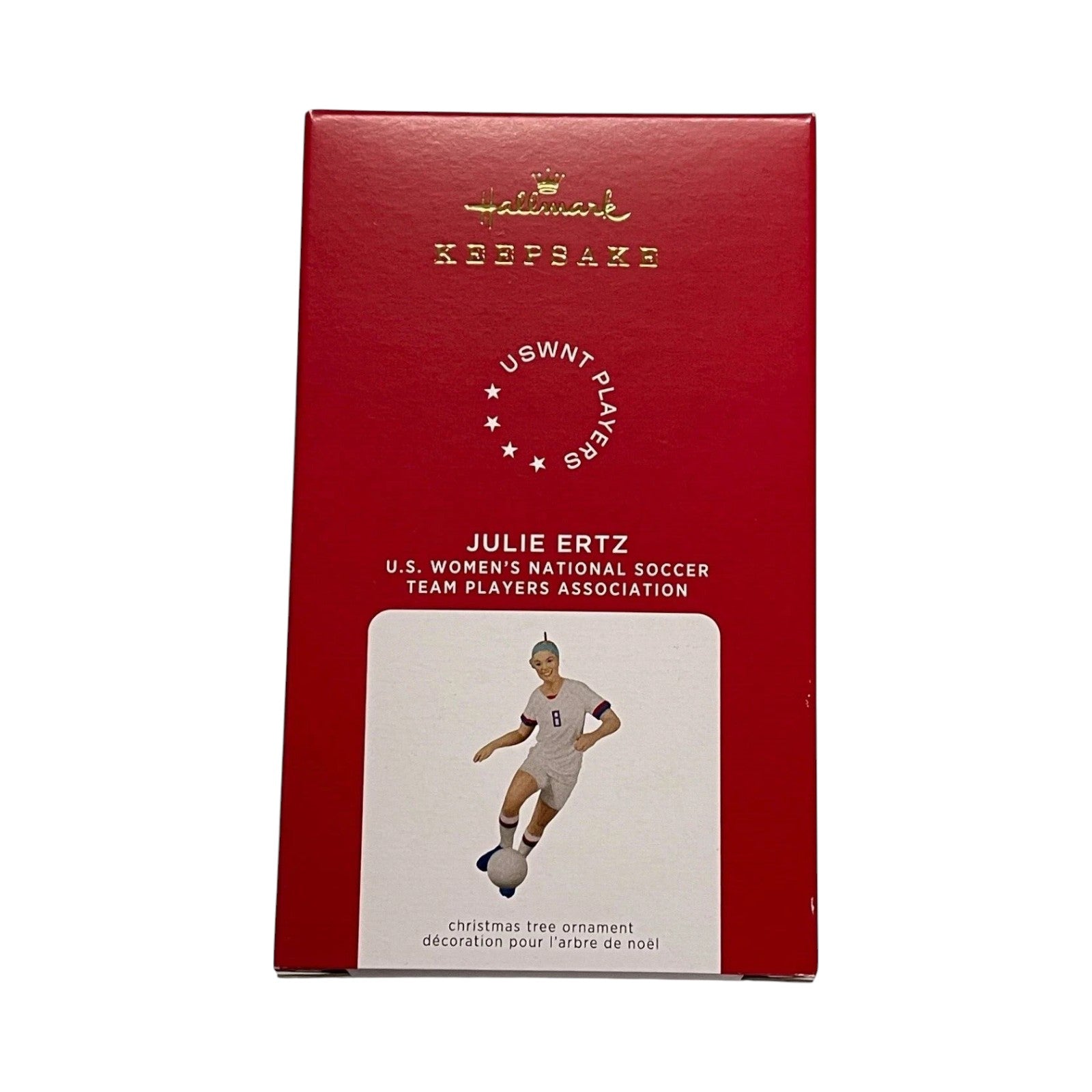 Score a goal for soccer fans with this 2021 miniature ornament featuring U.S. women's national team star Julie Ertz mid‑play, dribbling the ball in her iconic Team USA uniform. Designed with dynamic realism and team colors, it captures her athletic legacy and spirit. Each piece comes in its original Hallmark keepsake box with branded graphics and includes the protective inner tag—perfect for gifting, displaying, or safely storing. No batteries, cords, or light strings required—just sporty elegance in a compact keepsake.