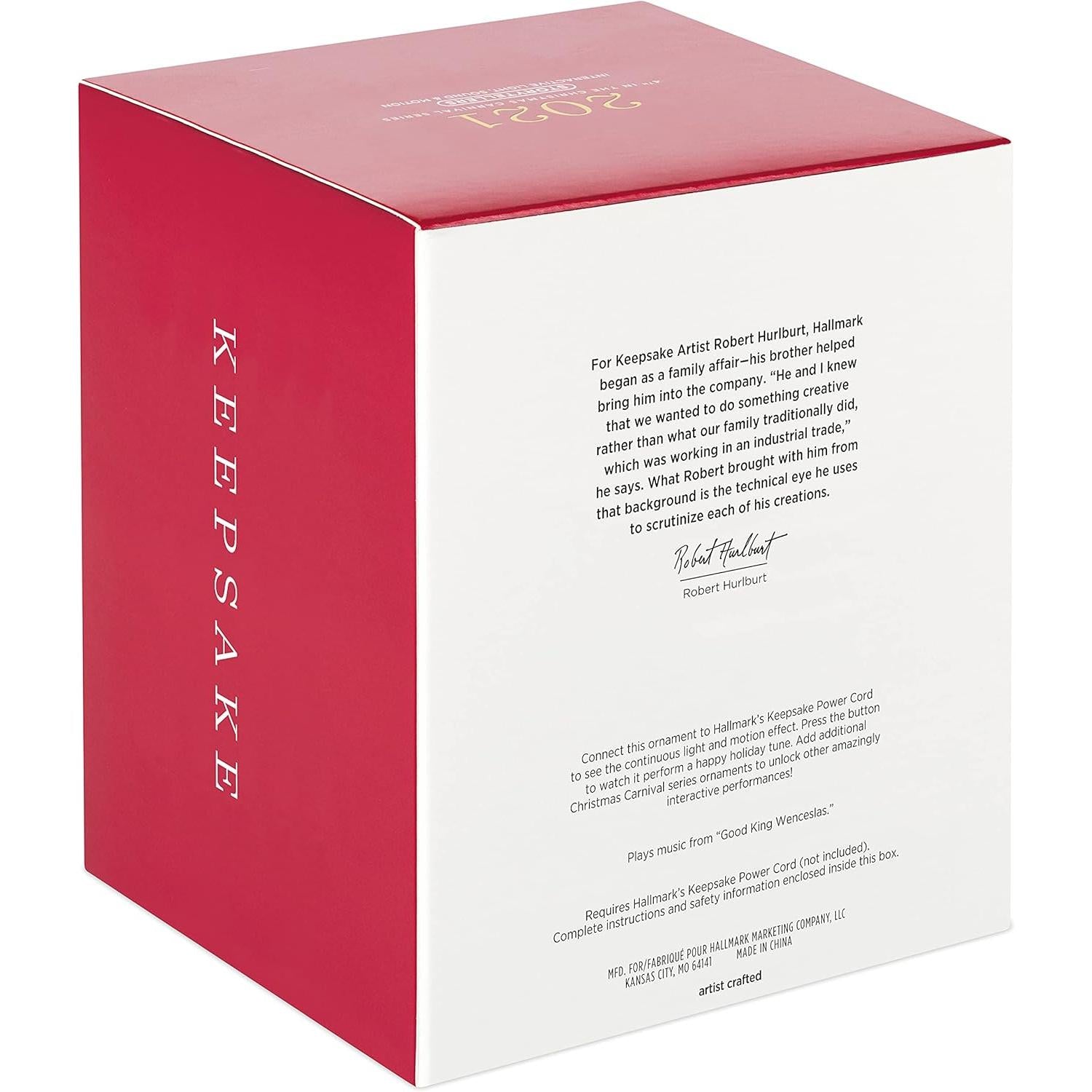 Step into a festive wonderland with the 2021 Rock Candy Express ornament from Hallmark's Christmas Carnival series. This enchanting piece features a whimsical train adorned with peppermint wheels and a snow-covered mountain of colorful rock candy at its center. Designed by artist Robert Hurlburt, this ornament brings the magic of a carnival ride to your holiday decor. When connected to Hallmark's Keepsake Power Cord (sold separately), it illuminates with continuous light and motion. Press the button to hear it play the cheerful tune "Good King Wenceslas." Measuring approximately 3.87" W x 5.17" H x 3.84" D, it comes in its original packaging, making it an ideal gift or collectible.