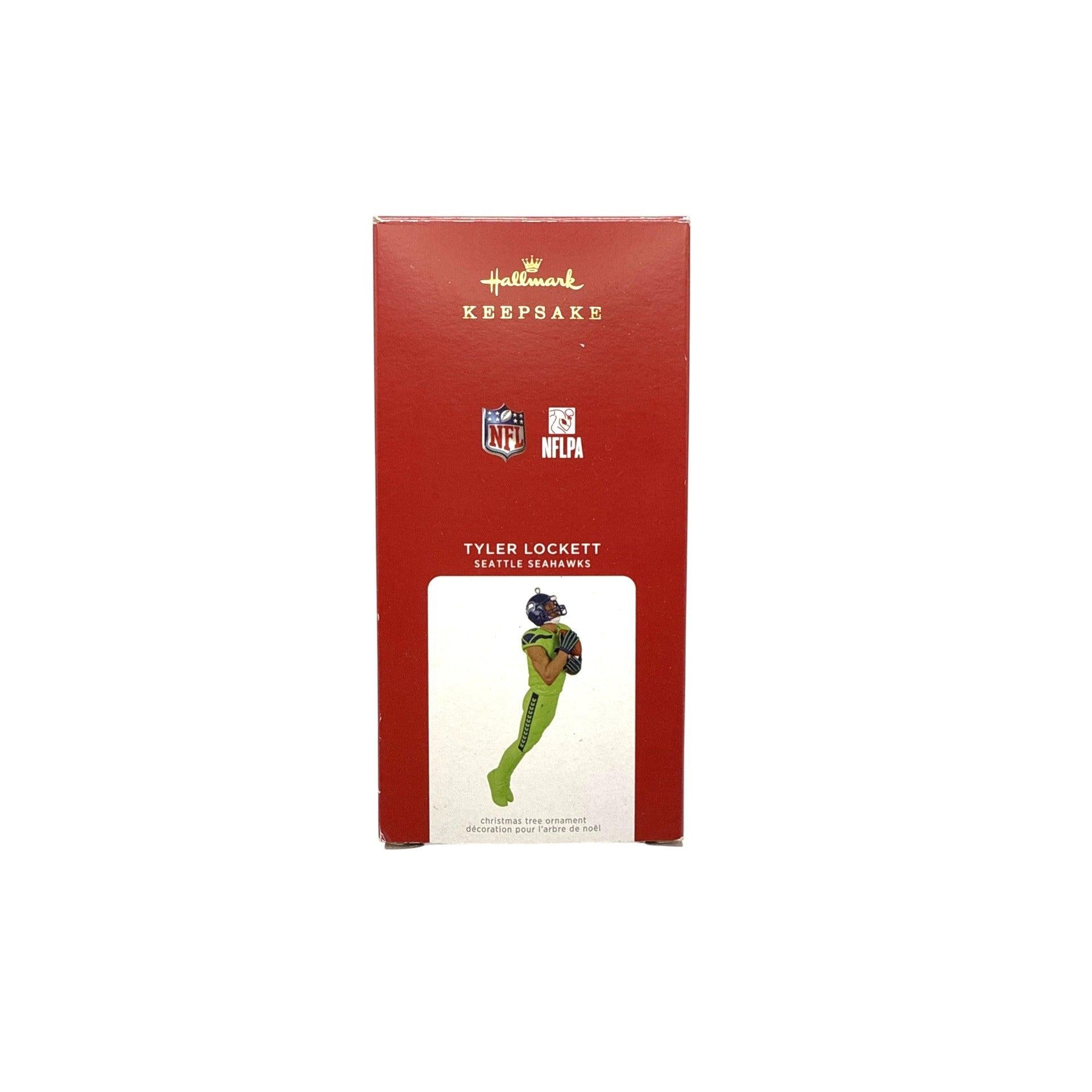 Celebrate the electrifying plays of Seattle Seahawks wide receiver Tyler Lockett with this Hallmark Keepsake Ornament from the Football Legends series. Capturing Lockett in his vibrant Action Green Color Rush uniform, the ornament showcases him mid-catch, embodying his dynamic on-field presence. this plastic ornament is dated 2021 and comes in its original packaging, making it a perfect gift for Seahawks fans and collectors alike.