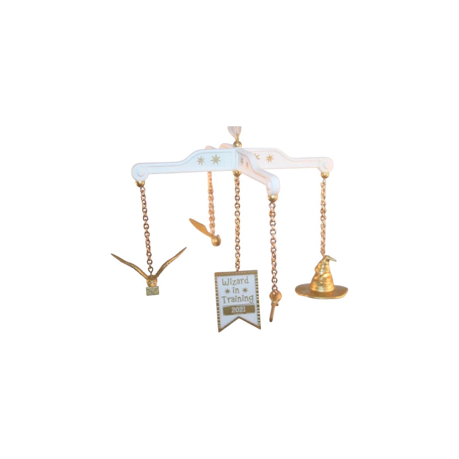 Celebrate a baby’s first Christmas—or the arrival of a future Potterhead—with the 2021 Wizard in Training (Harry Potter) ornament (QXI7112). Crafted by artist Gregor Benedetti, this adorable keepsake is shaped like a baby-mobile, with gold-hued charms of the Sorting Hat, broom, owl, and Golden Snitch dangling below a banner that reads Wizard in Training 2021. It’s hand-painted plastic, comes in its original box with tag, and requires No Power Needed—ready to hang straight out of the package
