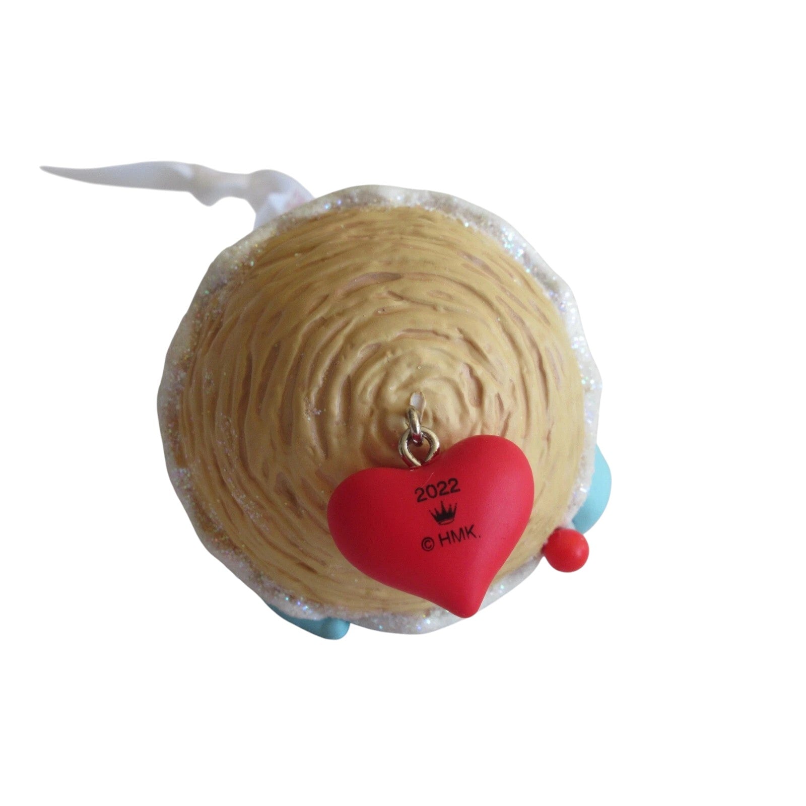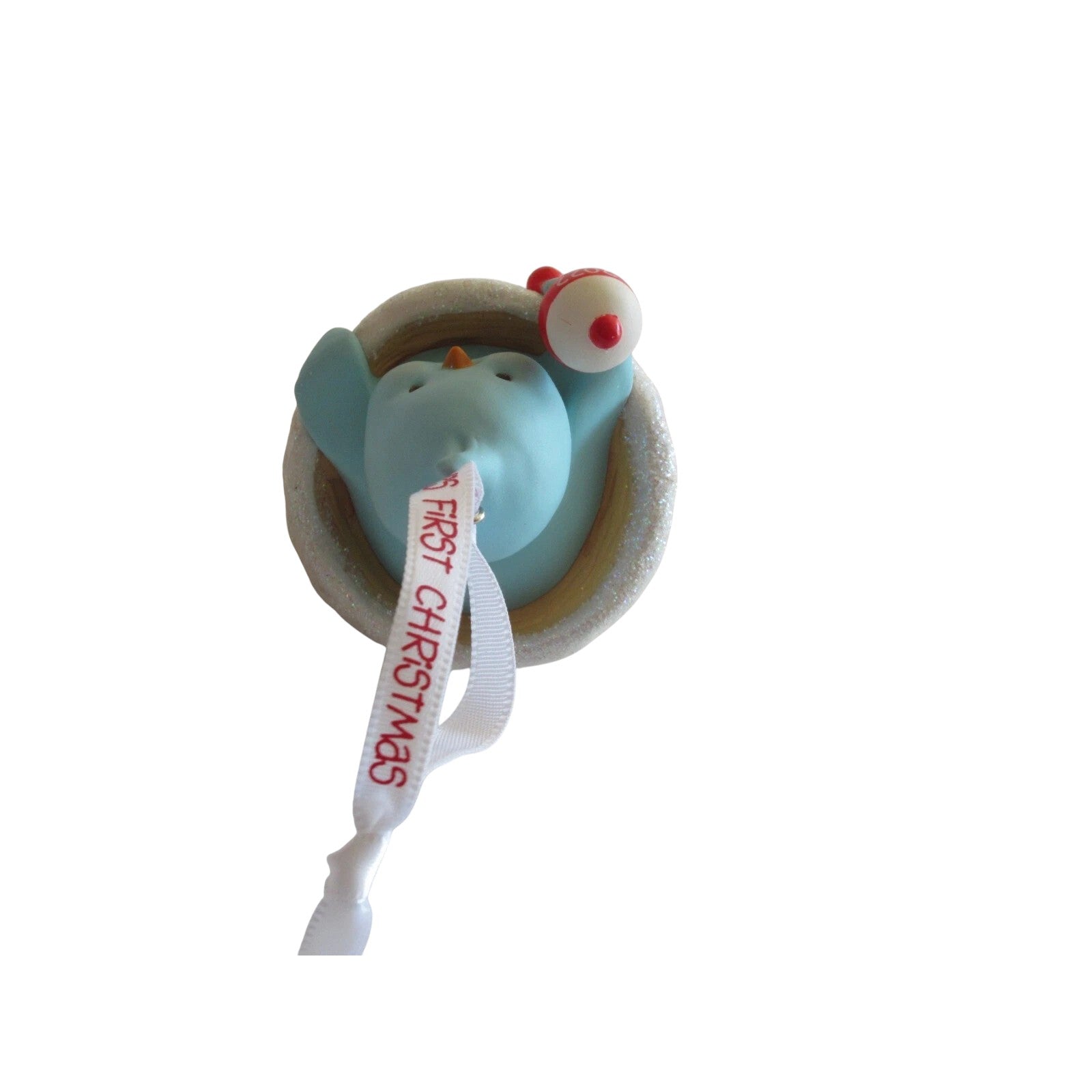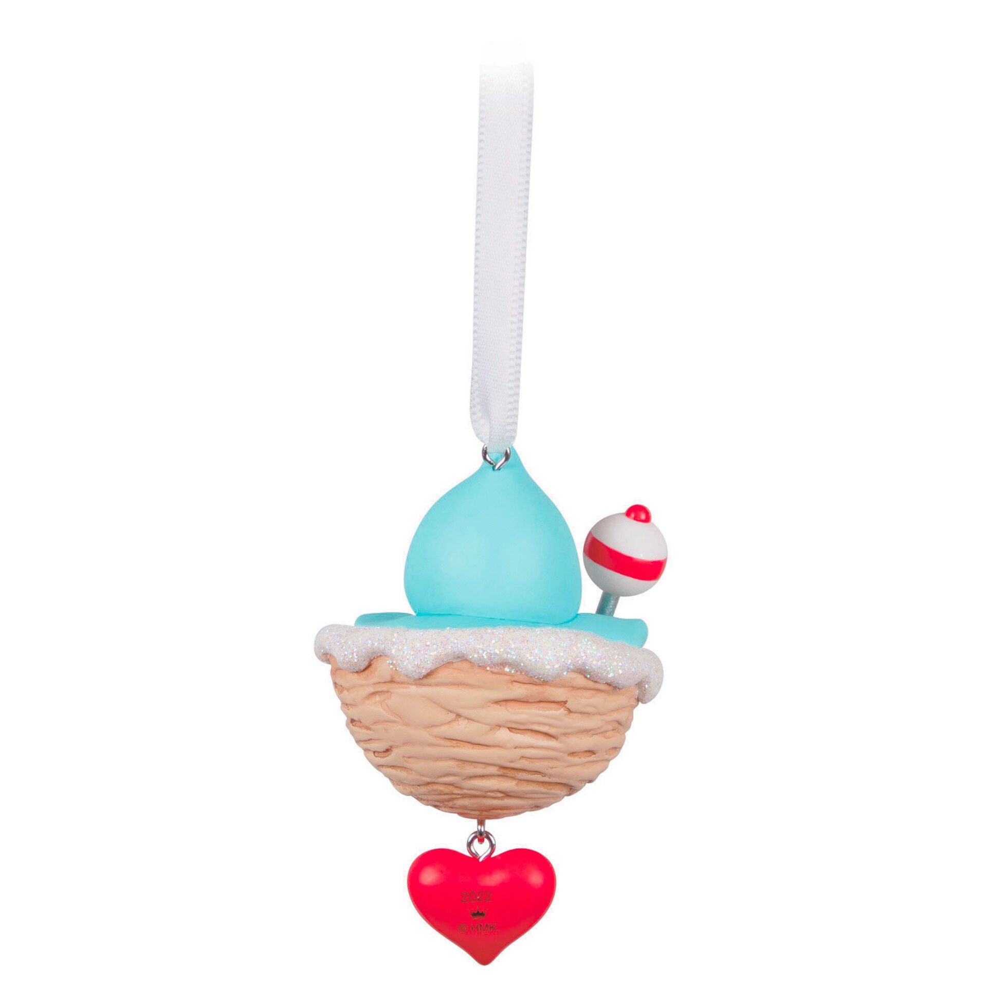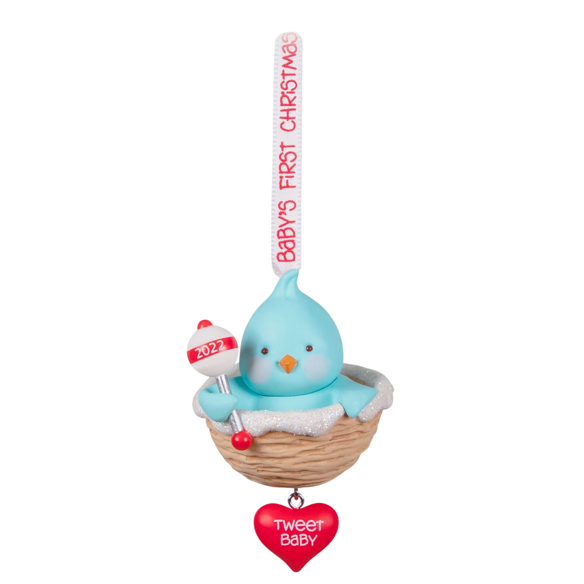 Celebrate a "tweet" addition to the family with the 2022 Baby Boy's First Christmas ornament from Hallmark. This charming design features a blue baby bird holding a tiny baby rattle, nestled in a cozy nest with a dangling heart-shaped charm. Snowy glitter accents add festive charm, making it a perfect keepsake for commemorating a baby's first holiday season.
