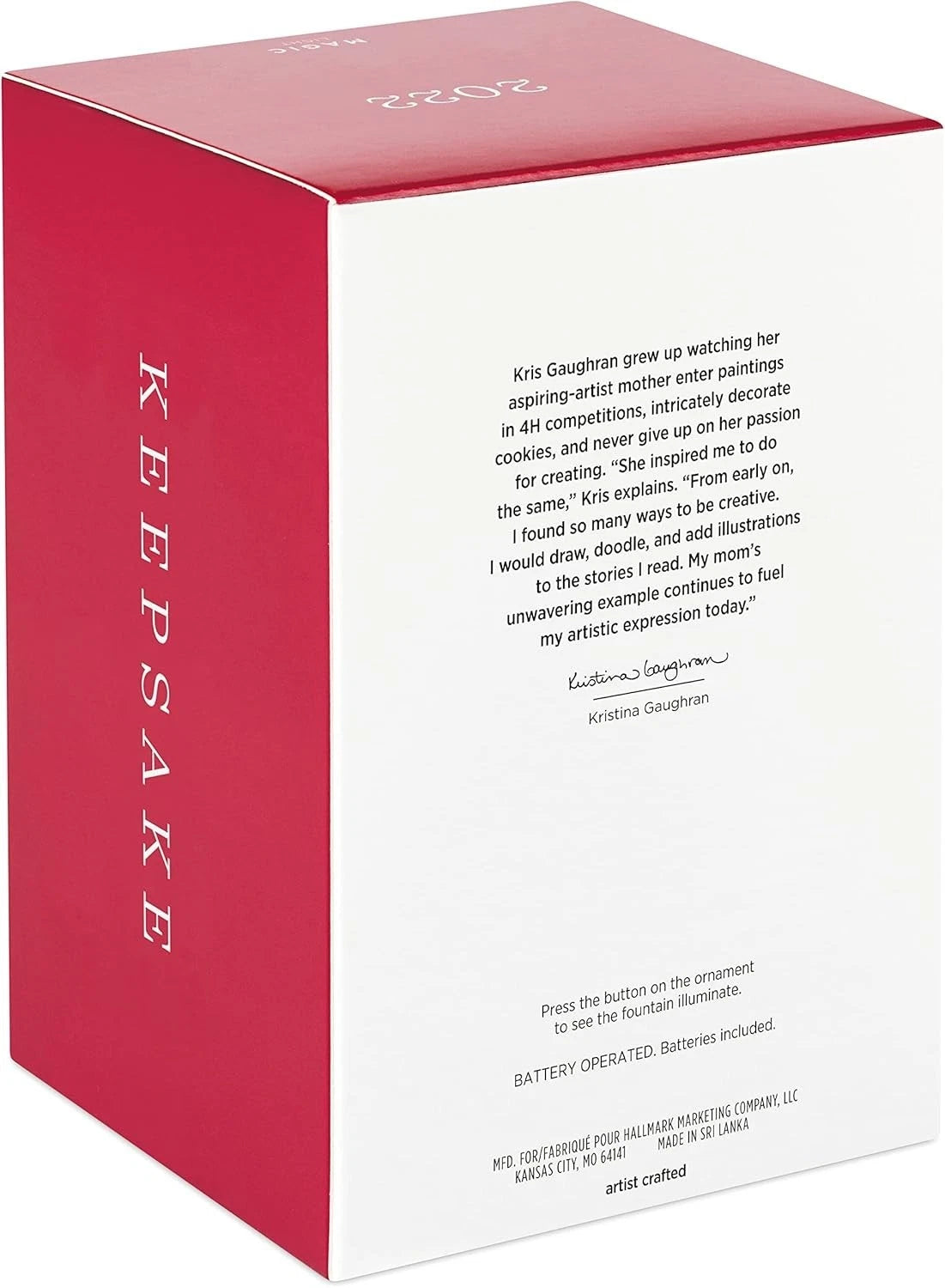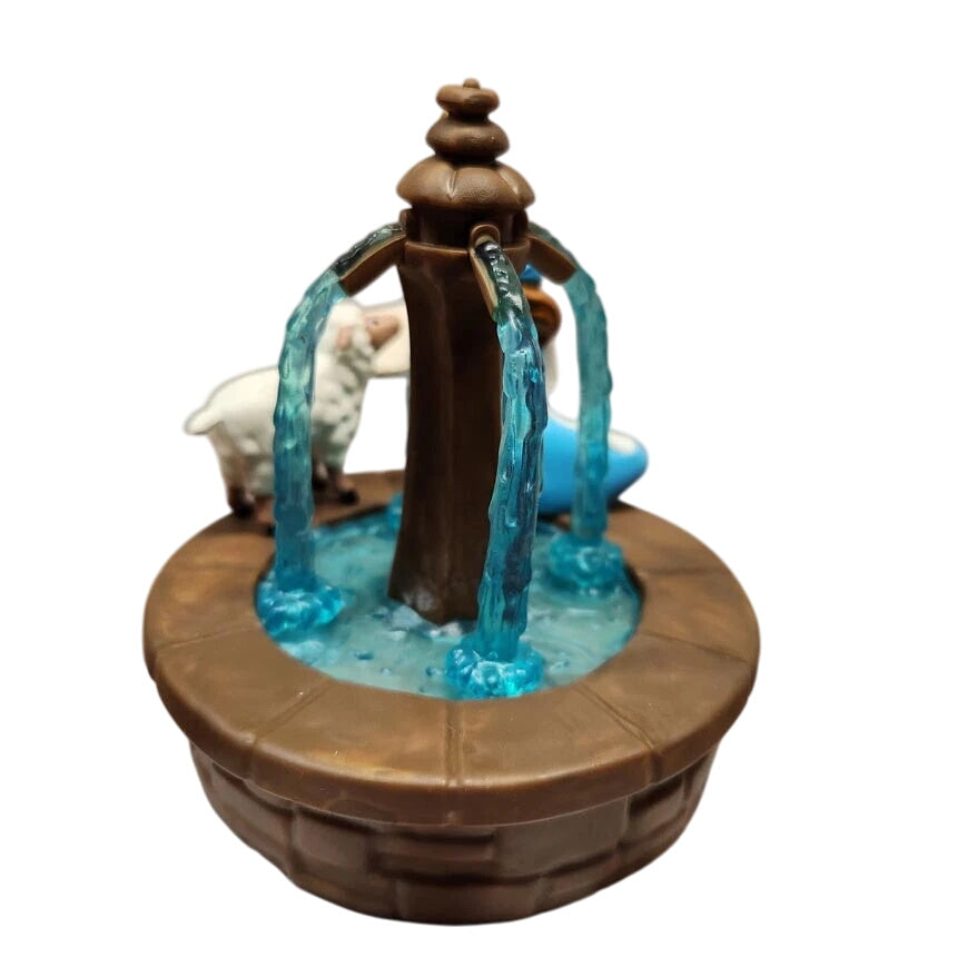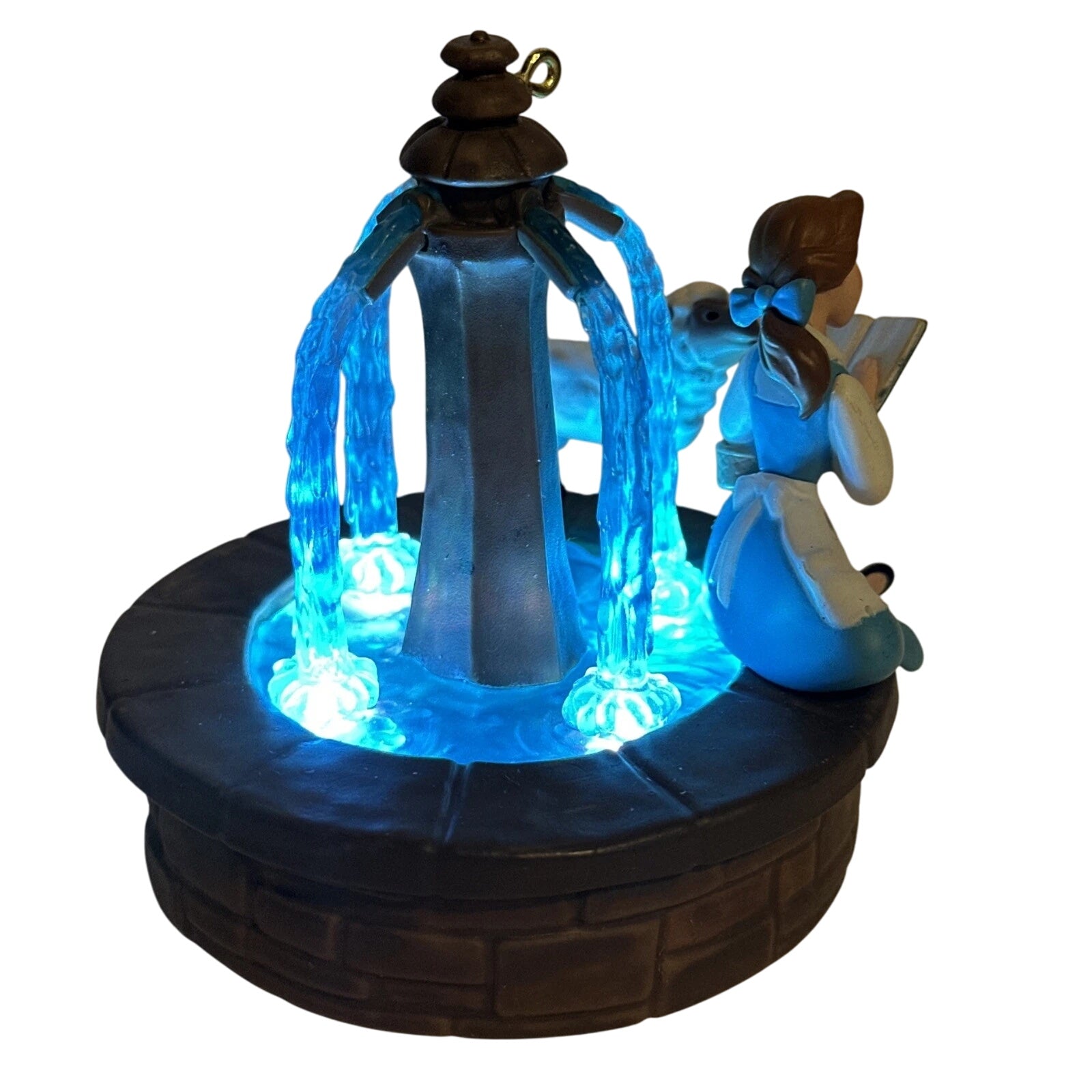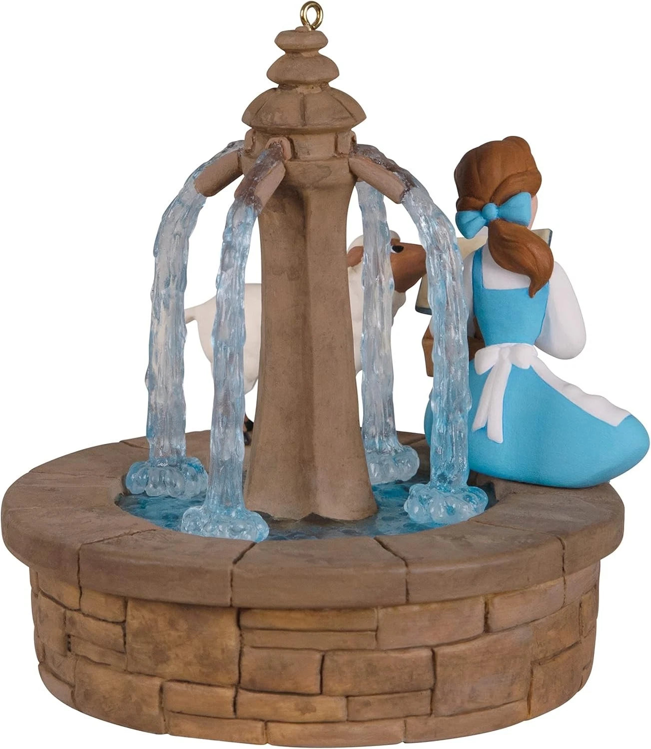 Celebrate Belle's love for reading with the 2022 Brilliant Belle ornament from Hallmark. This enchanting design captures the opening scene of Disney's Beauty and the Beast, featuring Belle sitting by a fountain, engrossed in her favorite book, with a sheep by her side. The ornament's fountain lights up, adding a magical glow to your holiday decor.