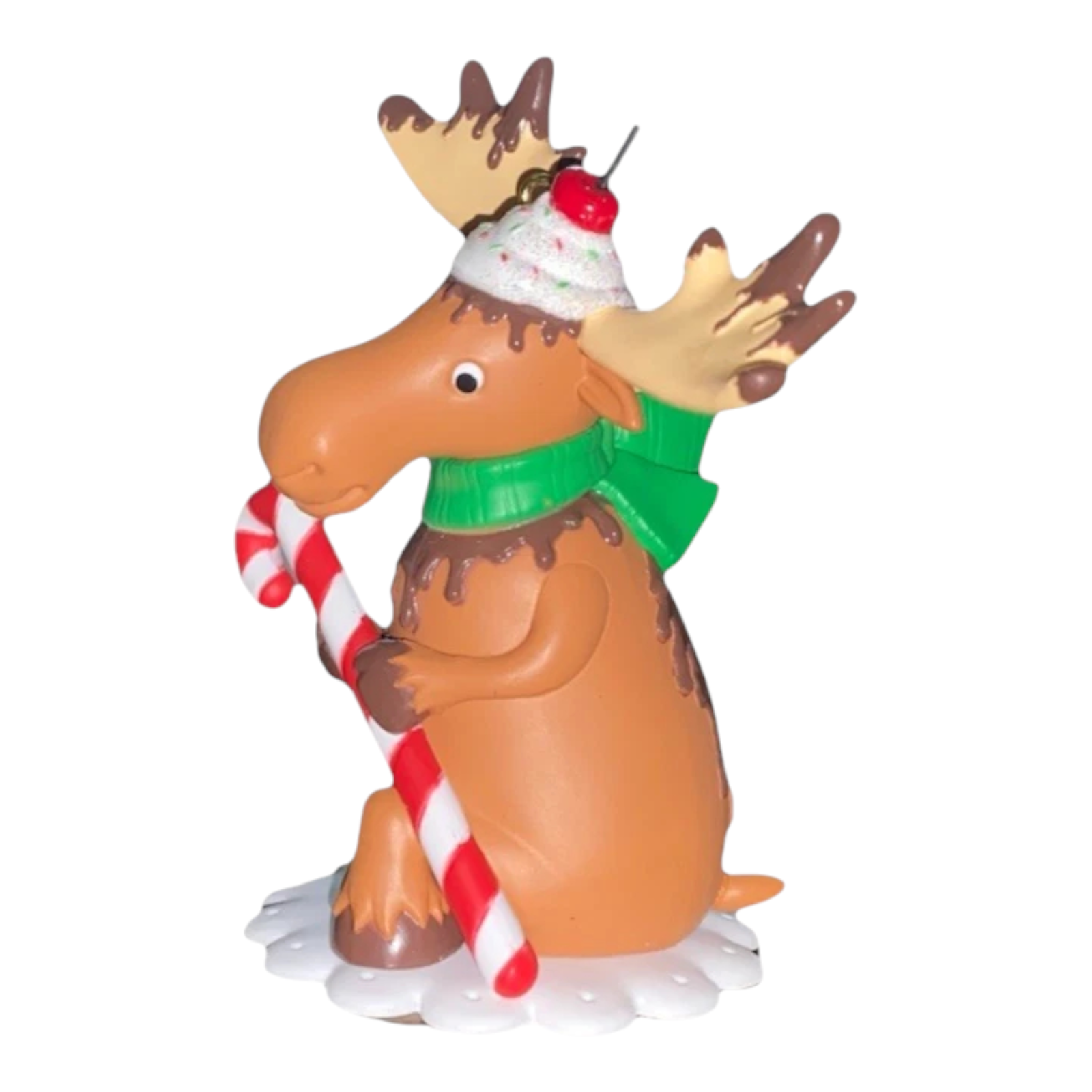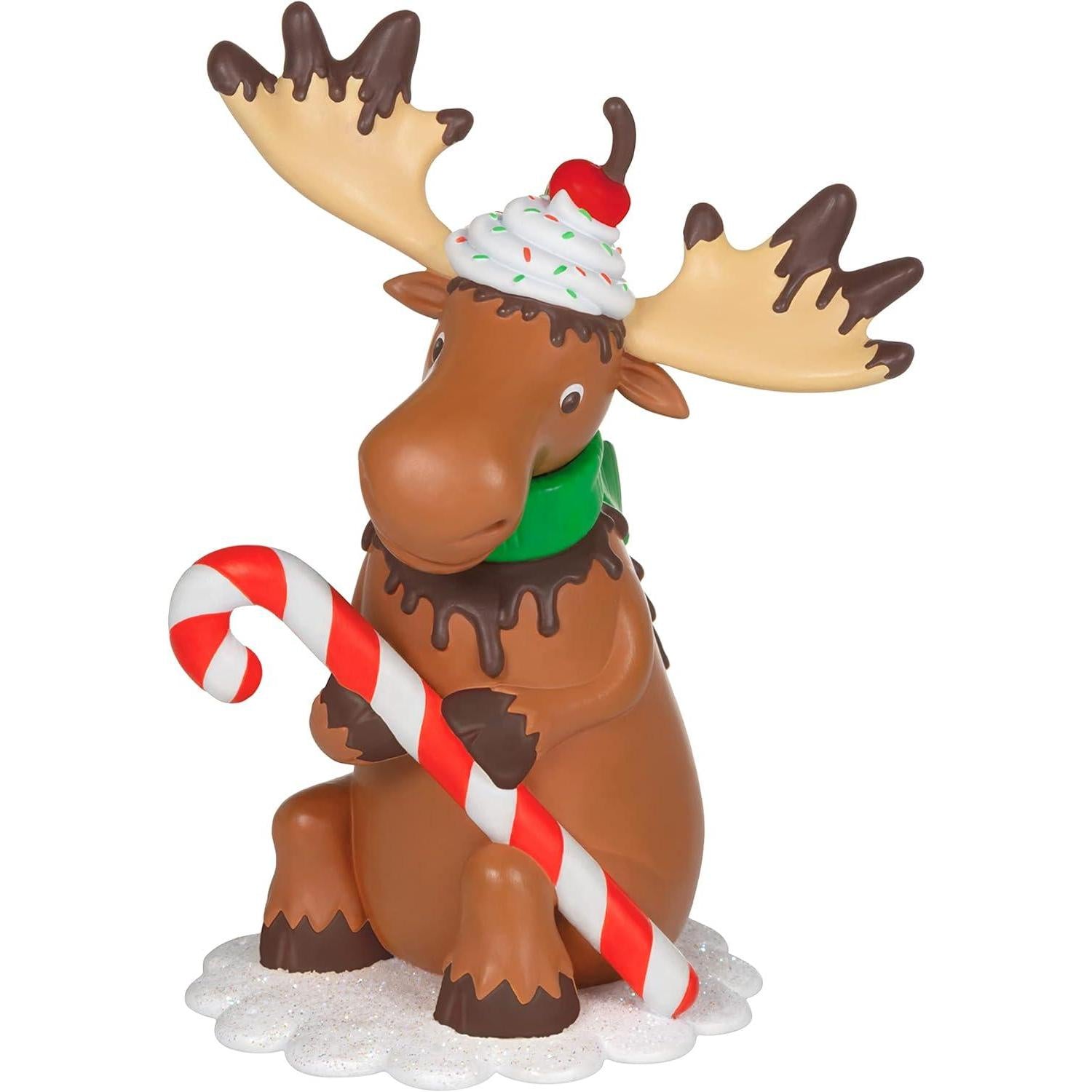 Sweeten your holiday decor with the 2022 Chocolate Moose ornament from Hallmark. This delightful design features a moose adorned with chocolate syrup and a cherry on top, holding a candy cane while sitting on a doily, this ornament adds a whimsical touch to your Christmas tree.