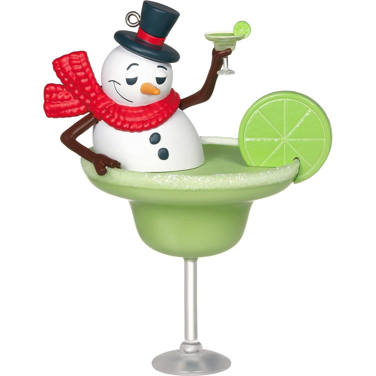 Celebrate the festive spirit with the 2022 Feliz Navidad ornament from Hallmark. This delightful design features a snowman enjoying a margarita in a lime-colored glass, complete with a lime wedge and a red scarf. Press the button to hear the classic holiday song "Feliz Navidad" performed by José Feliciano. Crafted by artist Allie Jachimowicz, this ornament adds a playful touch to your holiday decor.