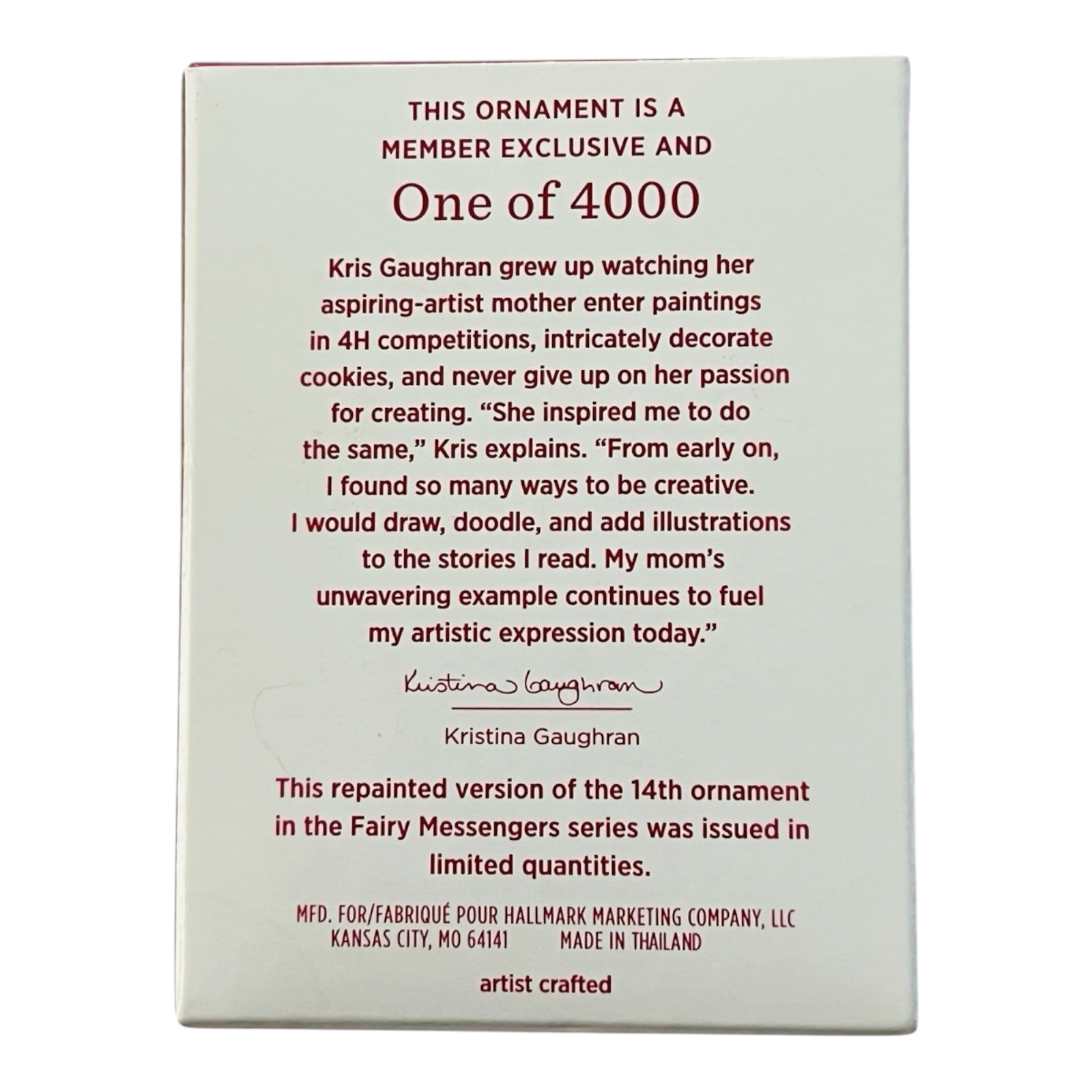 This exclusive 2022 release from the “Fairy Messengers” series by Hallmark is a member-only repaint version of the 2018 original. It features a whimsical fairy dressed in a morning-glory-petal inspired outfit, complete with iridescent wings and pastel accents—making it a charming and graceful piece for fairy-themed or holiday collections.