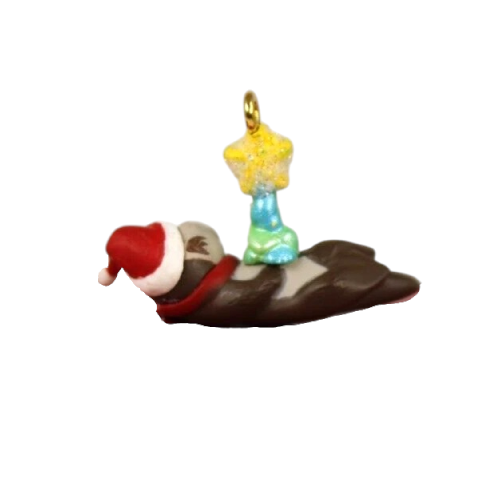 This delightful 2022 miniature from the Hallmark Keepsake line features a whimsical otter wearing a festive scarf and Santa hat, balancing a tiny stacked seashell “Christmas tree” on his tummy. The design’s charming marine-mammal whimsy blends with holiday cheer, making it a sweet addition to tree décor or a miniature collection of animals. Created by artists Gregor Benedetti and Matt Kesler, this piece stands out with fine sculpting and a cheerful personality—even at its miniature size. The otter theme taps into the popular “cute critter” category, offering strong appeal for both Hallmark ornament hunters and animal-loving decorators.
