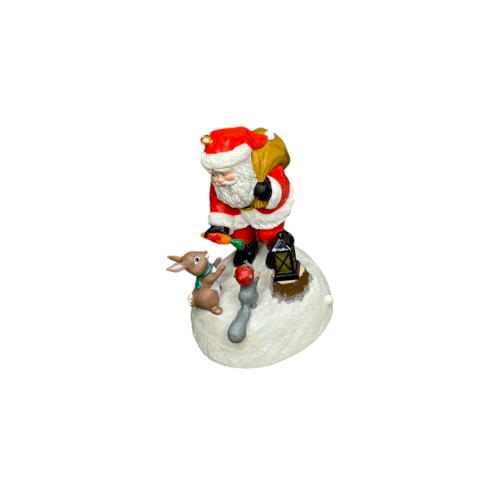 This keepsake ornament features a festive scene with Santa Claus greeting a bunny rabbit and a squirrel in a woodland-setting design. The ornament includes a lantern held by Santa which lights up and plays the music of “We Wish You a Merry Christmas” when activated. Crafted in plastic with a hand-finished look by artists Anita Marra Rogers and Gregor Benedetti, it adds both visual charm and an interactive element to a holiday collection. For collectors of light-and-sound ornaments or character-themed holiday décor, this model offers both date-marking (2022) and a collectible feature set.