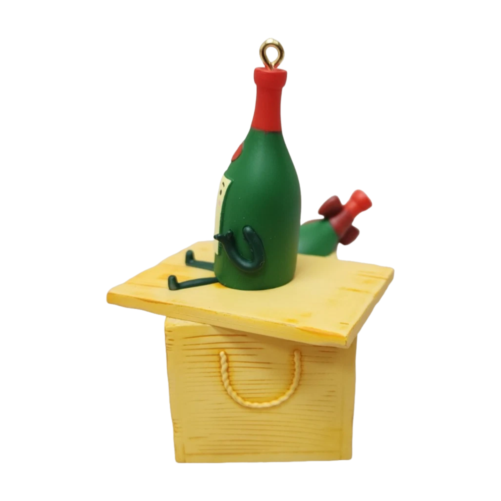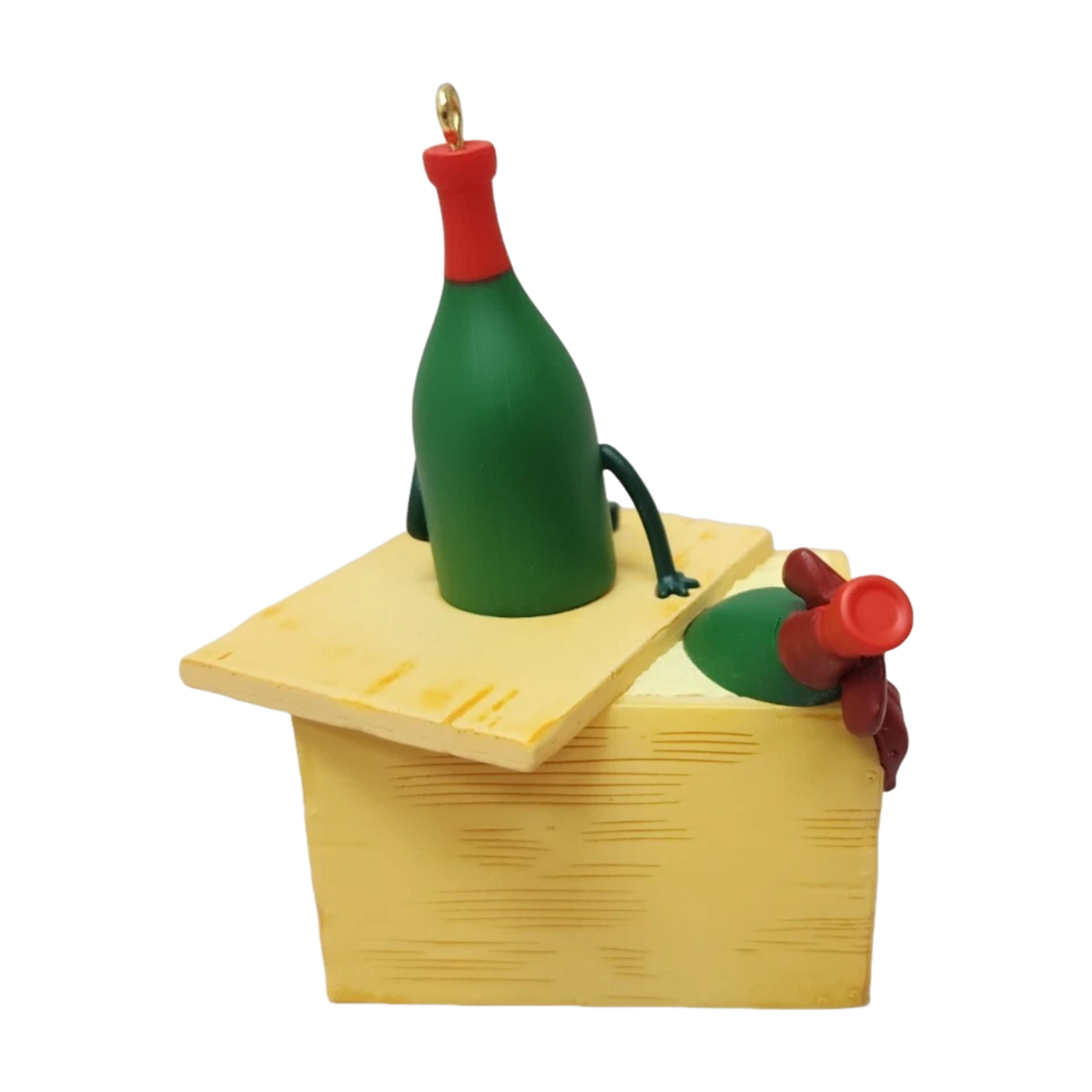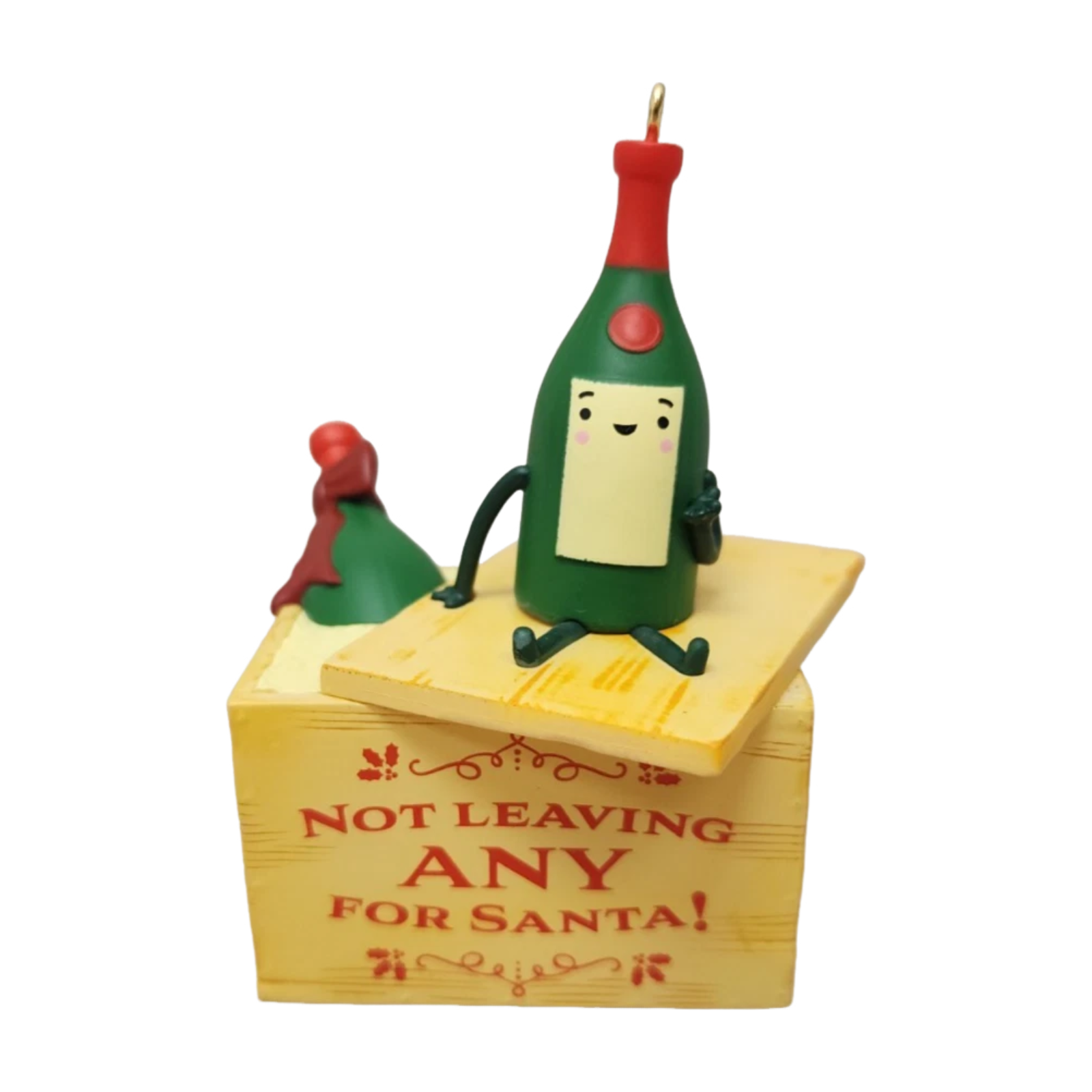 This light-hearted 2023 ornament from Hallmark Keepsake features a whimsical wine bottle character perched atop a gift box inscribed with “Not leaving any for Santa!” The design by artist Ramon Olivera captures both holiday cheer and a subtle nod to adult humour, making it an appealing choice for gifting or collectors of novelty holiday decorations.