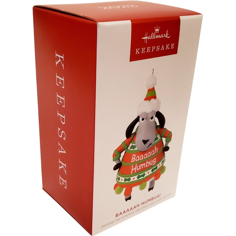 Add a dose of holiday humor to your tree with the 2023 BAAAAAAH Humbug! ornament. This delightfully grumpy sheep wears a red Santa hat and holds a sign that perfectly sums up the mood—“BAAAAAAH Humbug!” With textured fleece detail and a wonderfully annoyed expression, this ornament is perfect for animal lovers or anyone with a sense of seasonal sarcasm. Comes in the original Hallmark Keepsake box with tag. No batteries, cords, or accessories required.