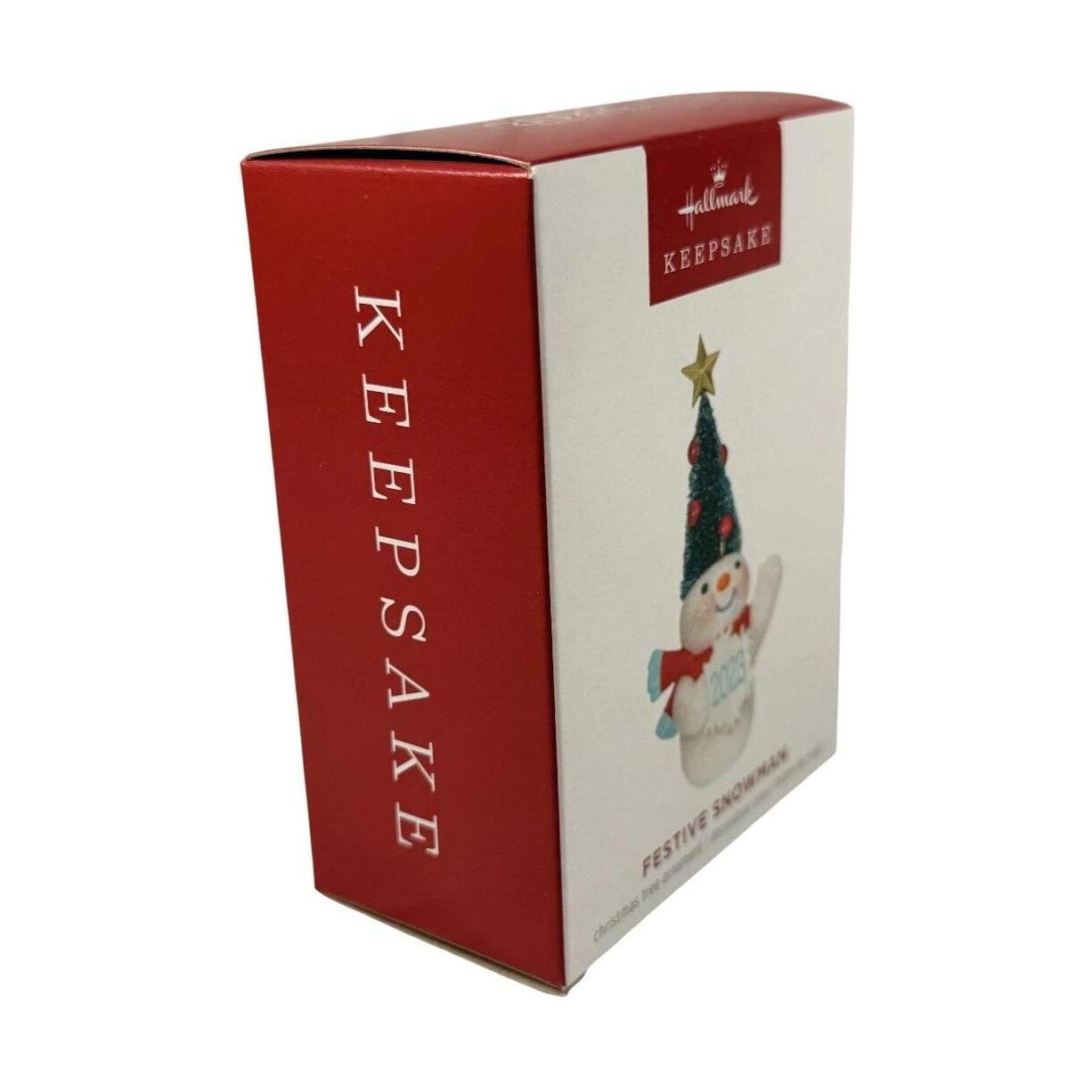 Add a joyful touch to your holiday décor with the 2023 Festive Snowman ornament from Hallmark's beloved Snowmen series. This charming snowman wears a classic red scarf and holds a festive wreath, all while standing cheerfully atop a snow-dusted base. Crafted with delightful details and sparkly accents, this ornament is a celebration of wintry fun. It comes packaged in a Hallmark Keepsake box and does not require any cords, batteries, or adapters—just hang it and enjoy.