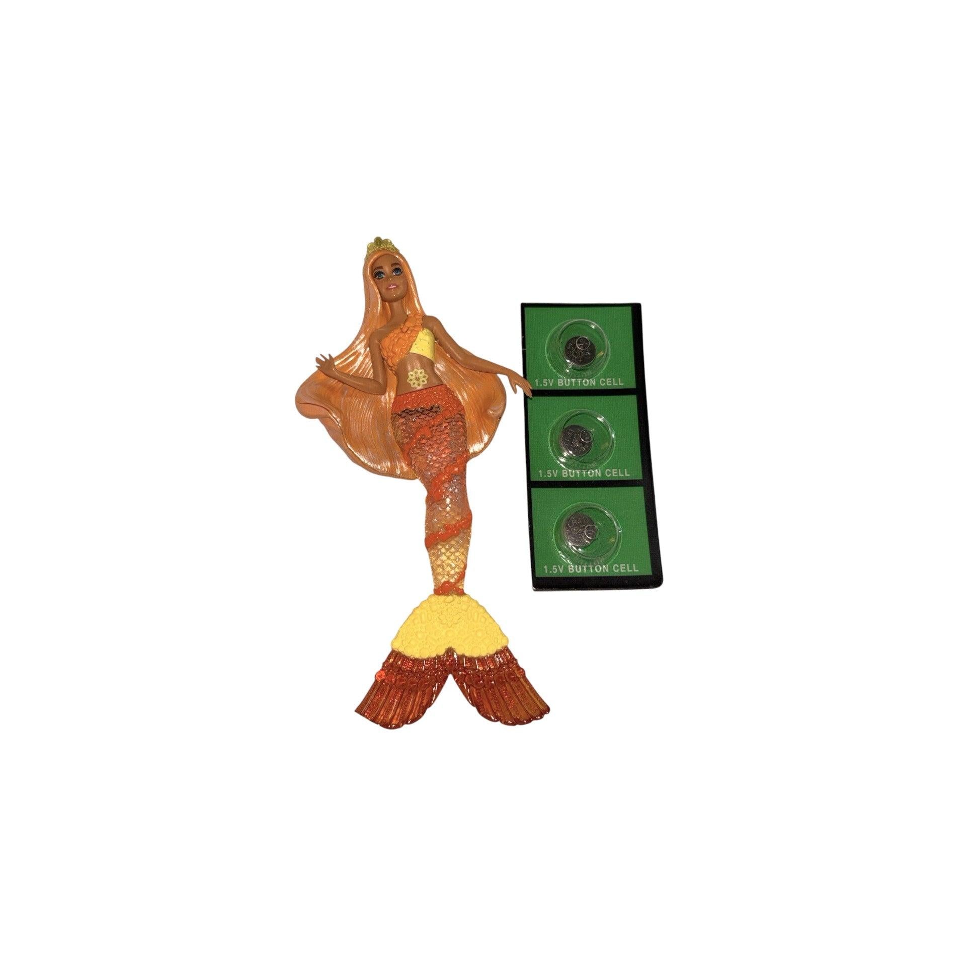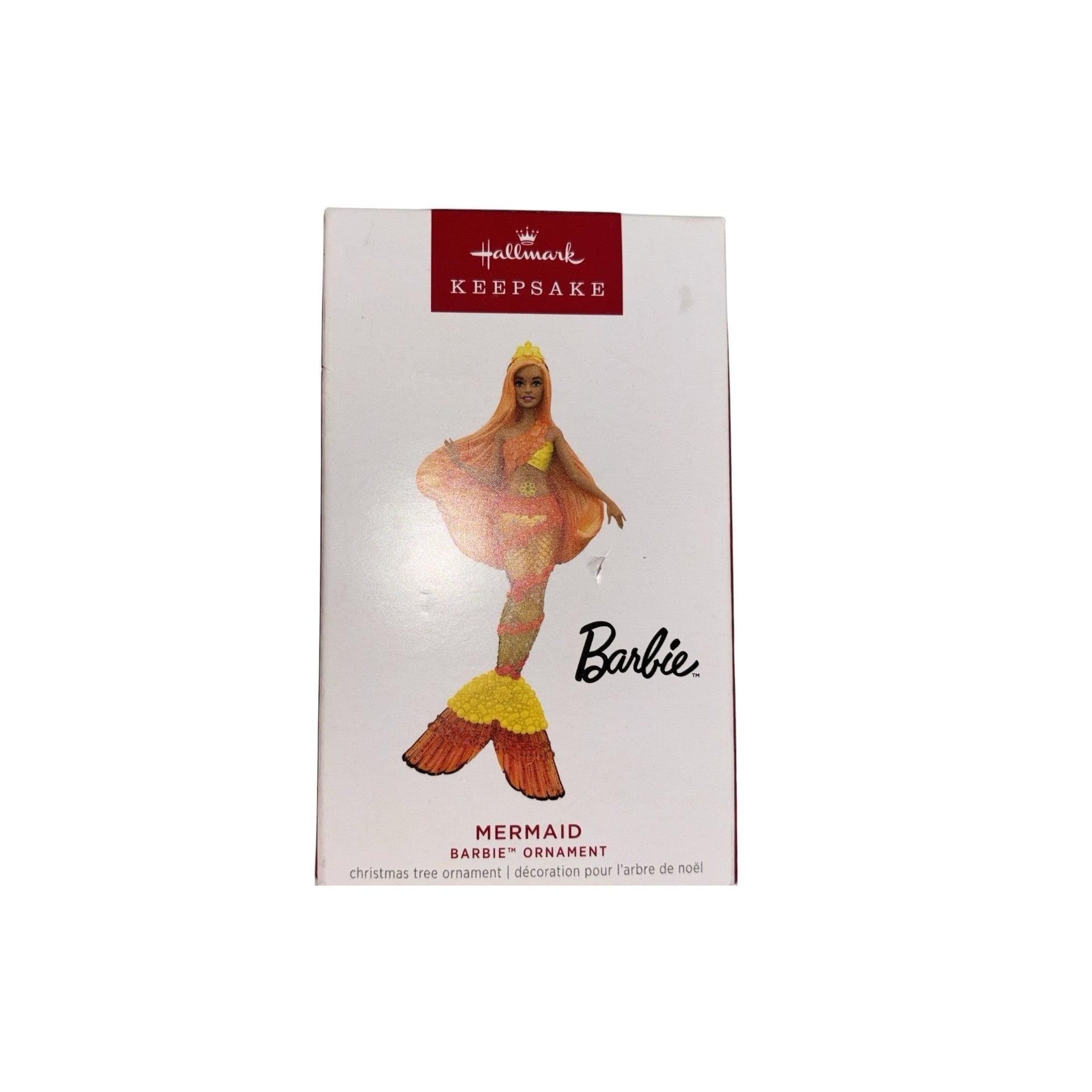 Make a splash on your tree with Mermaid Barbie (2023), featuring Barbie in a bright mermaid look with flowing orange hair and a colorful, shimmery tail fin that lights up for extra sparkle. This listing includes one ornament and is typically found new in the original Hallmark gift box (box and packaging inserts may vary by seller). To activate the light feature, press the button on the ornament—it is battery-operated and does not use cords or light strings.