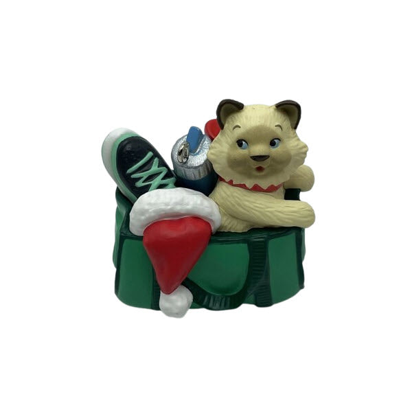 Celebrate 25 years of playful feline fun with the 2023 Mischievous Kittens ornament—the 25th entry in Hallmark’s delightful Mischievous Kittens series. This charming keepsake features a curious calico kitten nestled inside a green gym bag alongside sneakers, a water bottle, and a Santa hat, wearing a festive red bow. Crafted by Nina Aubé and sculpted in durable plastic, the ornament measures approximately 1.87″ W × 2″ H × 1.46″ D, arrives mint-in-box with the original tag, and requires No Power Needed