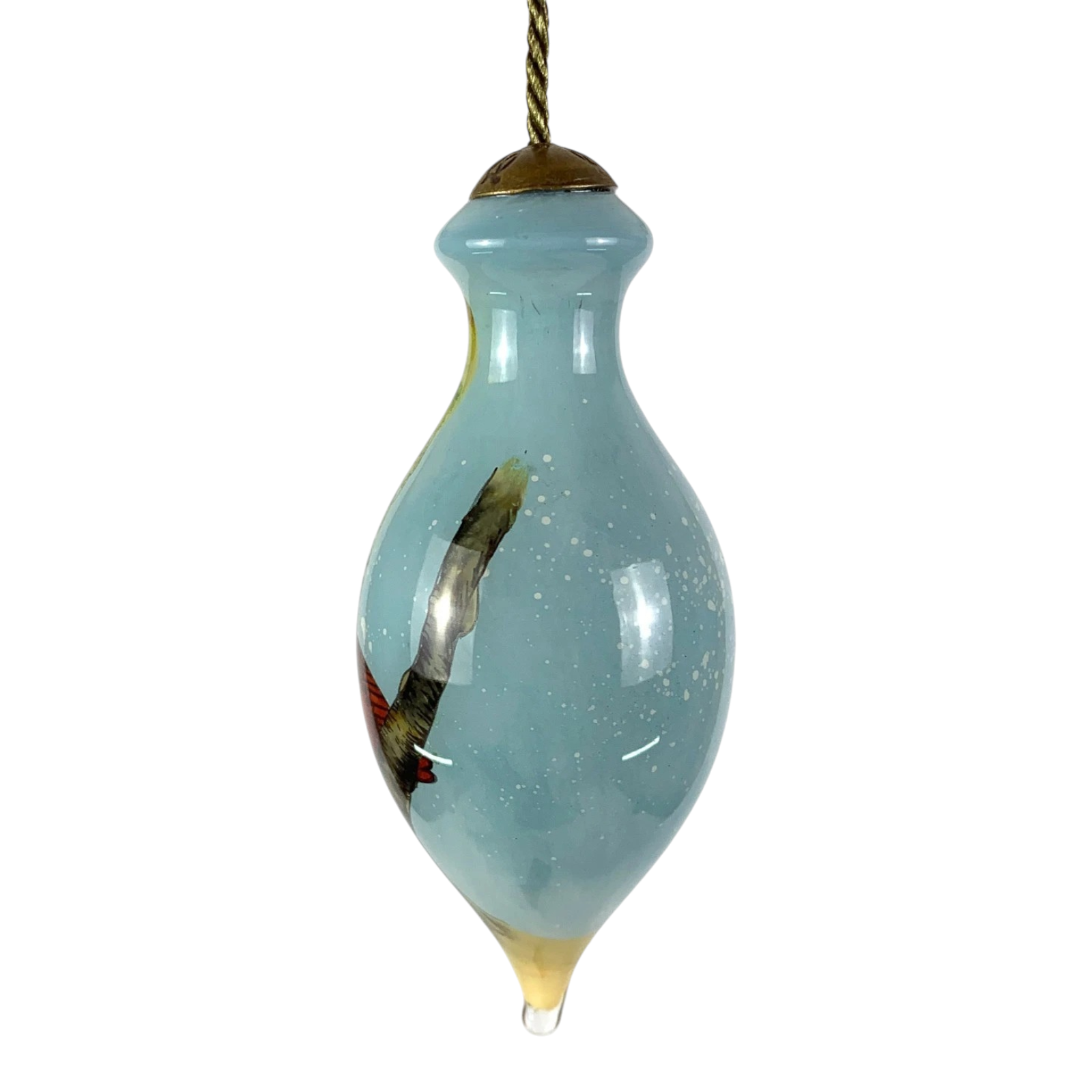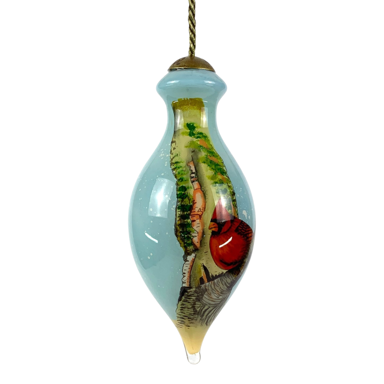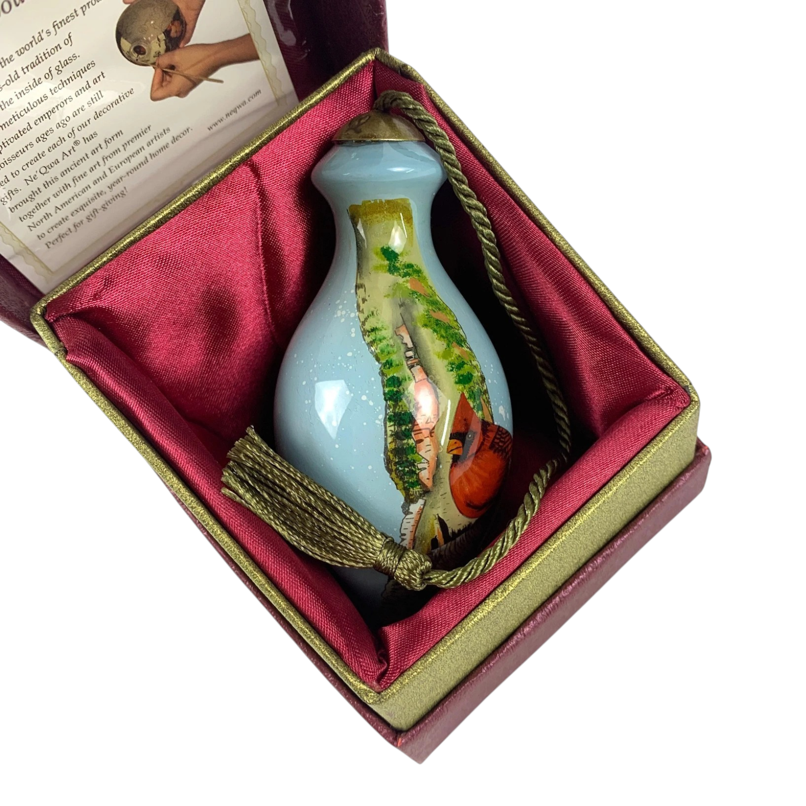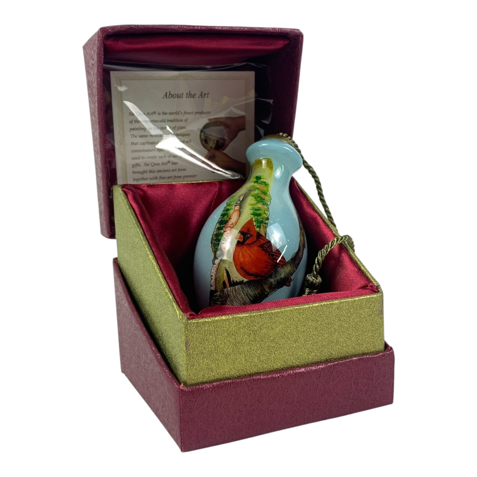This exquisite ornament features a vibrant red cardinal perched on a branch, inspired by the original artwork of Tracy Lizotte, symbolizing loved ones who remain close to our hearts. The piece is crafted using mouth-blown glass and reverse hand-painting (art painted on the inside), a hallmark of Ne’Qwa Art’s craftsmanship. Housed in a satin-lined keepsake presentation box and accompanied by a Certificate of Authenticity, it offers both visual elegance and emotional resonance—making it a meaningful keepsake for holidays, remembrance occasions or collector displays.