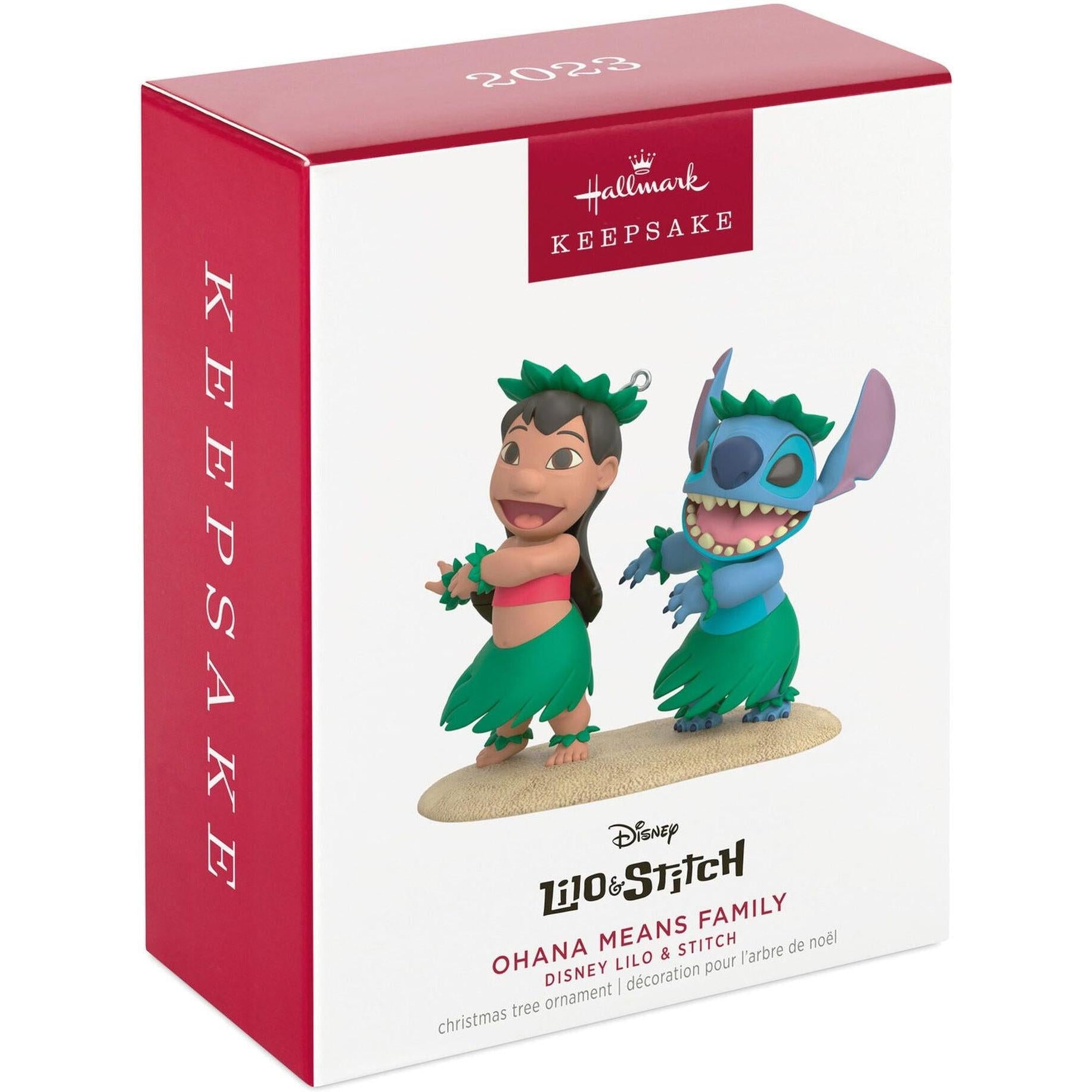 Celebrate the meaning of family with the 2023 Ohana Means Family ornament, featuring beloved Disney characters Lilo and Stitch sharing a heartwarming hug. This beautifully detailed ornament captures the essence of their unbreakable bond and brings a touch of aloha spirit to your Christmas tree. It includes the original Hallmark Keepsake box and coordinating tag. No batteries or cords are required—just a heartfelt moment ready to hang.