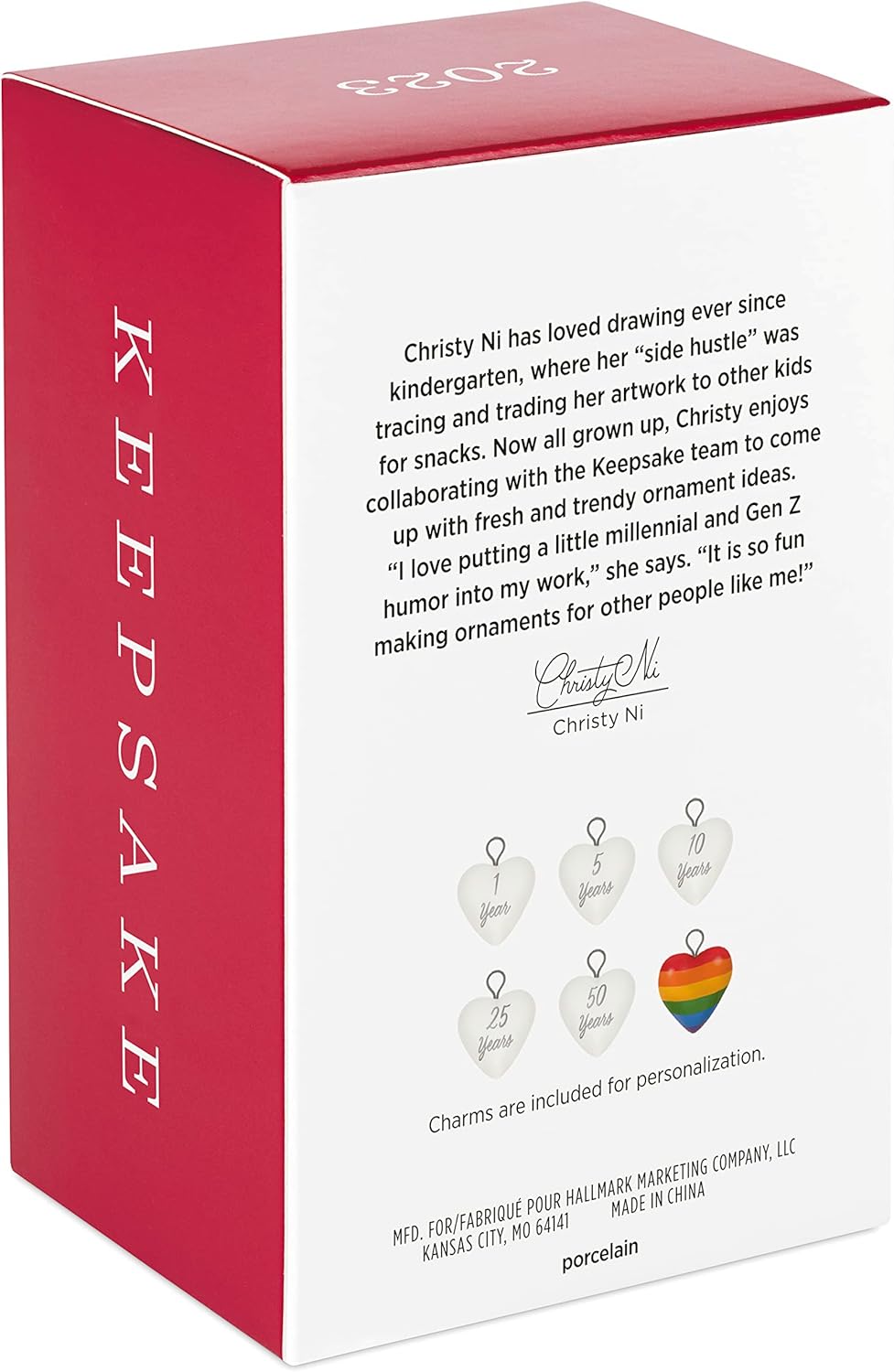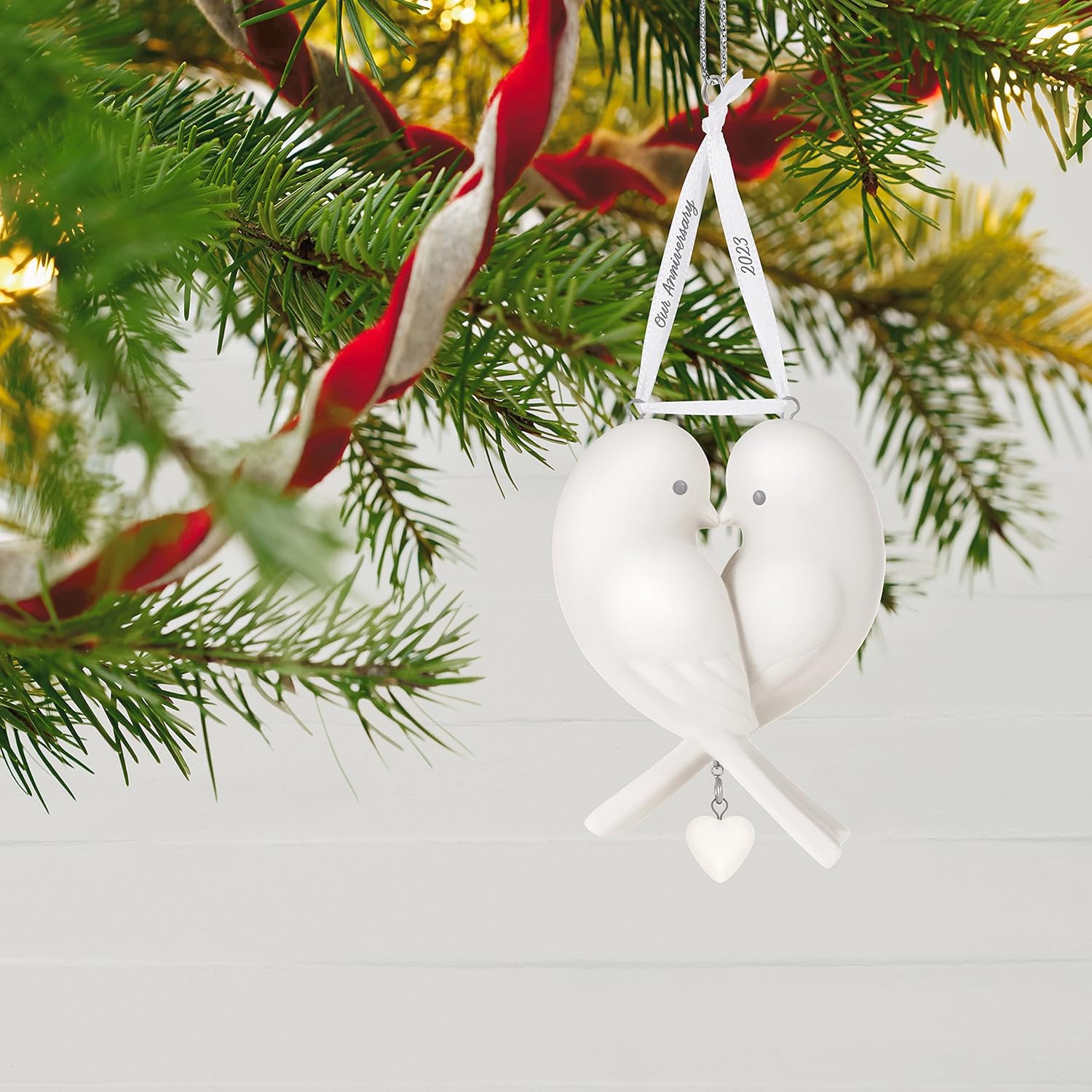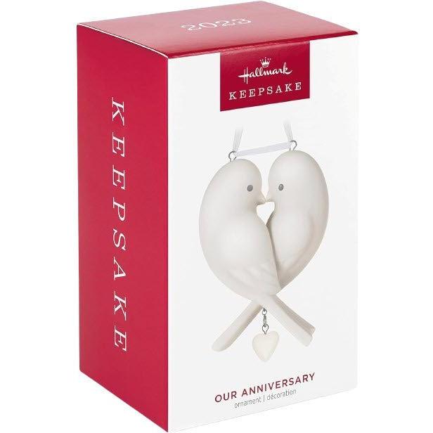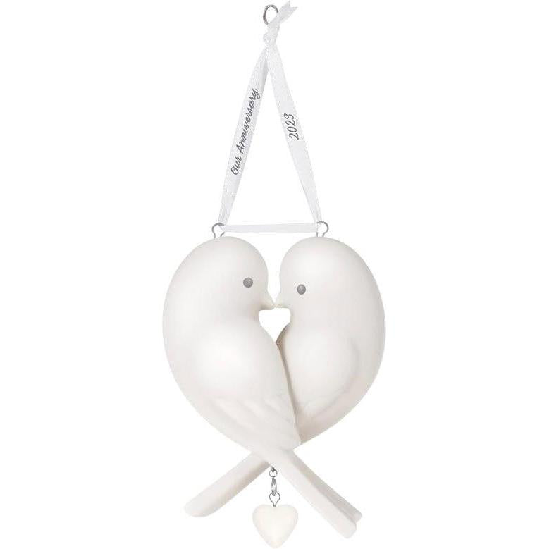Celebrate love and togetherness with 2023 Our Anniversary (Anniversary), a beautifully crafted porcelain keepsake ornament. This piece features two lovebirds that join to form a heart—symbolizing unity and affection. Included are several heart-shaped charms so you can personalize the ornament for milestone years like 1, 5, 10, 25, or 50, plus a blank or rainbow charm for your own touch.