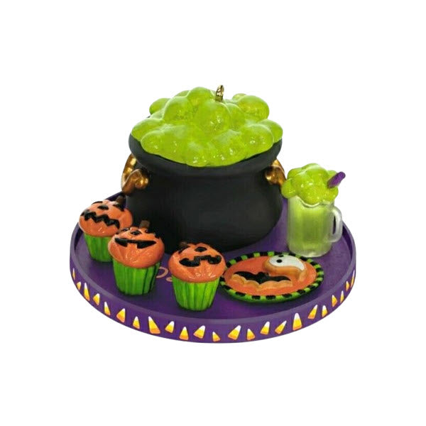 Add spooky sweetness to your Halloween décor with the 2023 Season’s Treatings (Halloween) ornament. This festive keepsake features a bubbling cauldron with green potion, spooky bat- and ghost-shaped cookies, jack-o'-lantern cupcakes, and a frosty lime drink—arranged on a purple platter edged with candy corn motifs. Designed by Sharon Visker, this plastic/resin ornament arrives with the original box and tag. Measuring about 2.75″ × 1.62″ × 2.75″, it requires no batteries, cords, or light strings—simply hang and enjoy the frightful fun immediately.