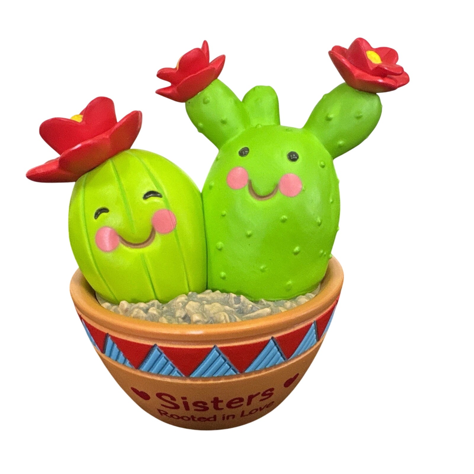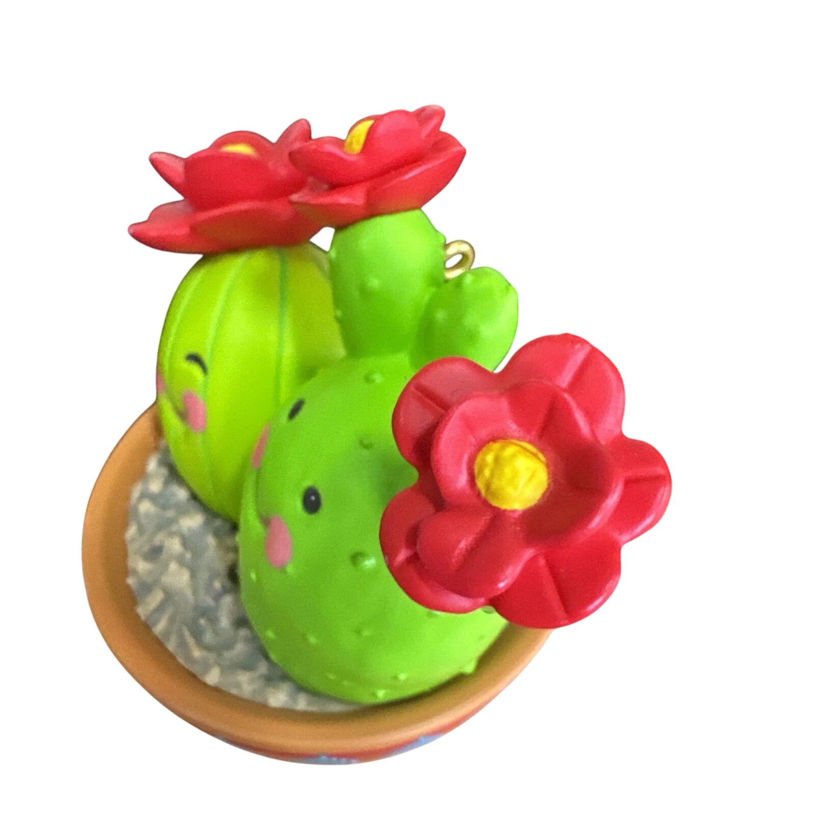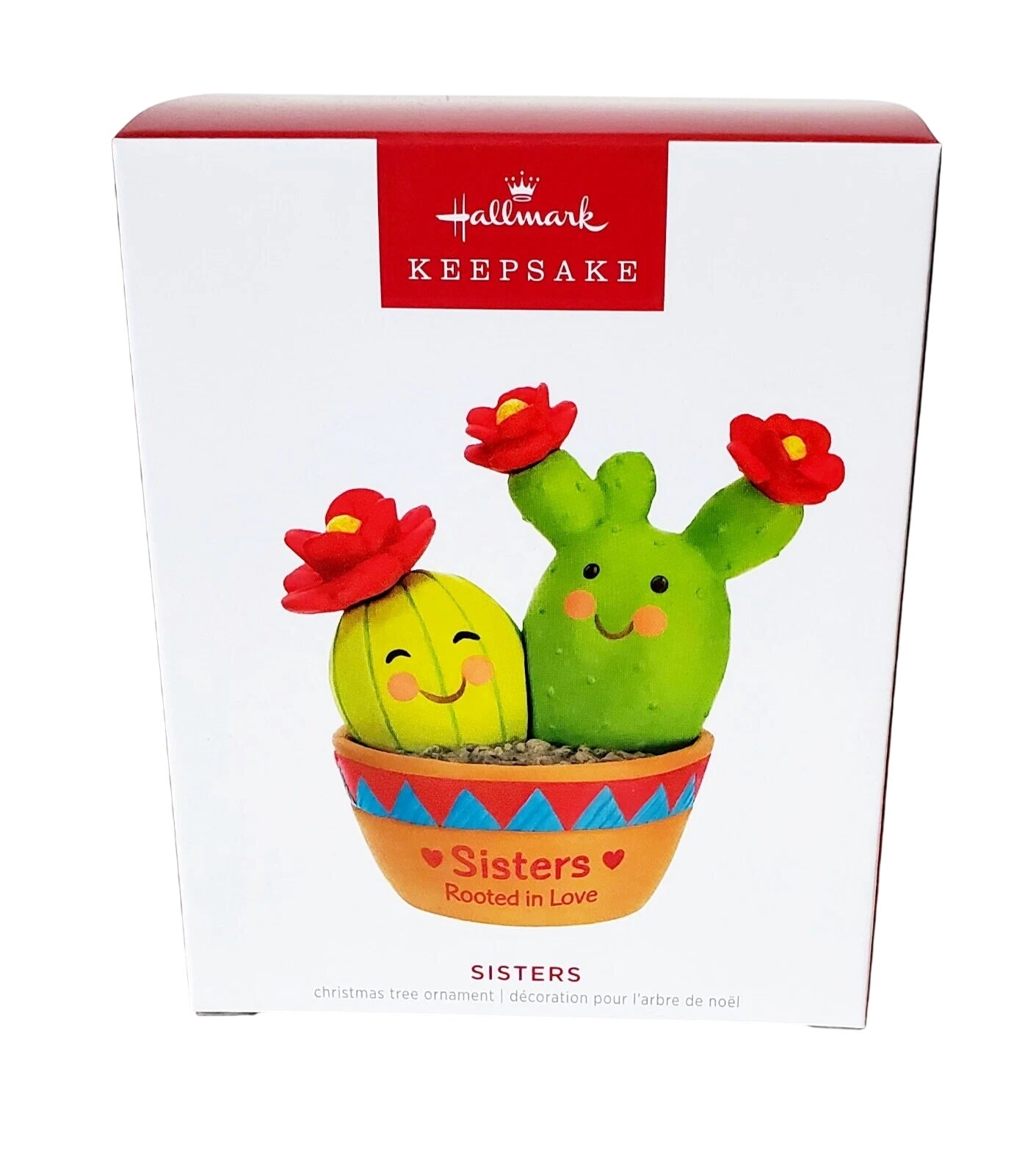 Celebrate the unbreakable bond of sisterhood with the 2023 Sisters Hallmark Keepsake Ornament. This charming design features two smiling cacti in a shared terracotta pot, adorned with vibrant red flowers. The inscription "Sisters rooted in love" encapsulates the enduring connection between siblings. Crafted from hand-painted resin, this ornament measures approximately 2.94" x 2.86" x 2.01" and comes in its original gift box, making it a perfect gift for sisters or friends who are like family.