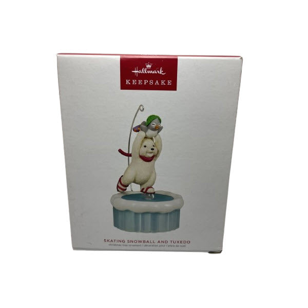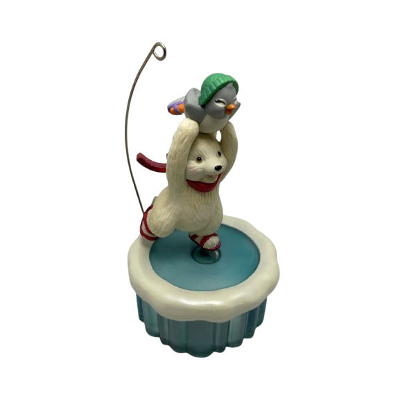 This 2023 “Magic Motion” ornament features Snowball the polar bear and his friend Tuxedo the penguin skating together across an icy rink. When connected to Hallmark’s Keepsake Power Cord (sold separately), the figures move across the ice and play motion effects. The sculpt by artist Joanne Wright shows detailed expressions, textured clothing, and a vivid scene of winter fun.