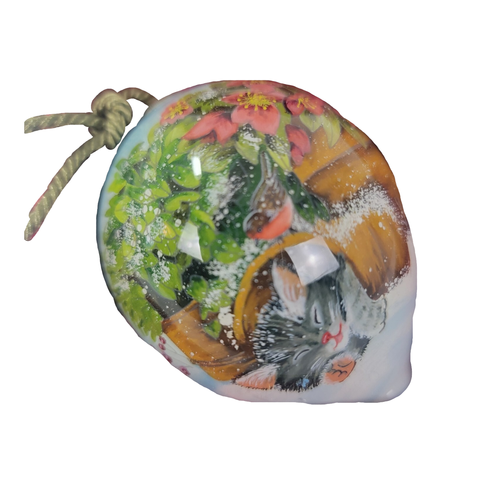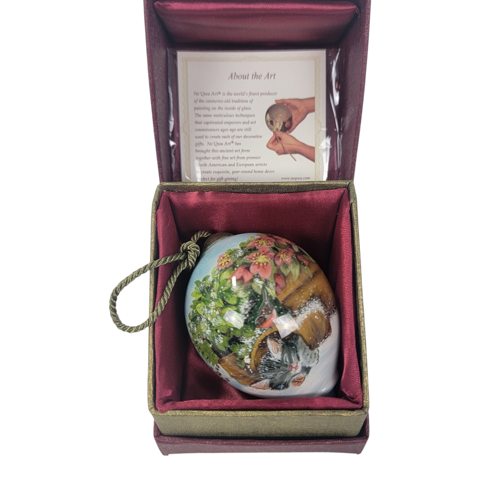 This elegant mouth-blown glass ornament features a sweet o kitten curled up among snow-dusted holiday greenery, while a curious little bird hovers nearby, checking in to play in the whisper of winter’s hush. Inspired by the festive artwork of Hazel Lincoln and crafted with the brand’s signature reverse-painting-inside technique, the piece exudes a cozy, serene holiday atmosphere. Finished with a satin-lined keepsake box, certificate of authenticity, and an adjustable tasseled cord for versatile display, it makes a heartfelt gift for cat lovers, animal-themed collectors or anyone seeking a refined seasonal accent.