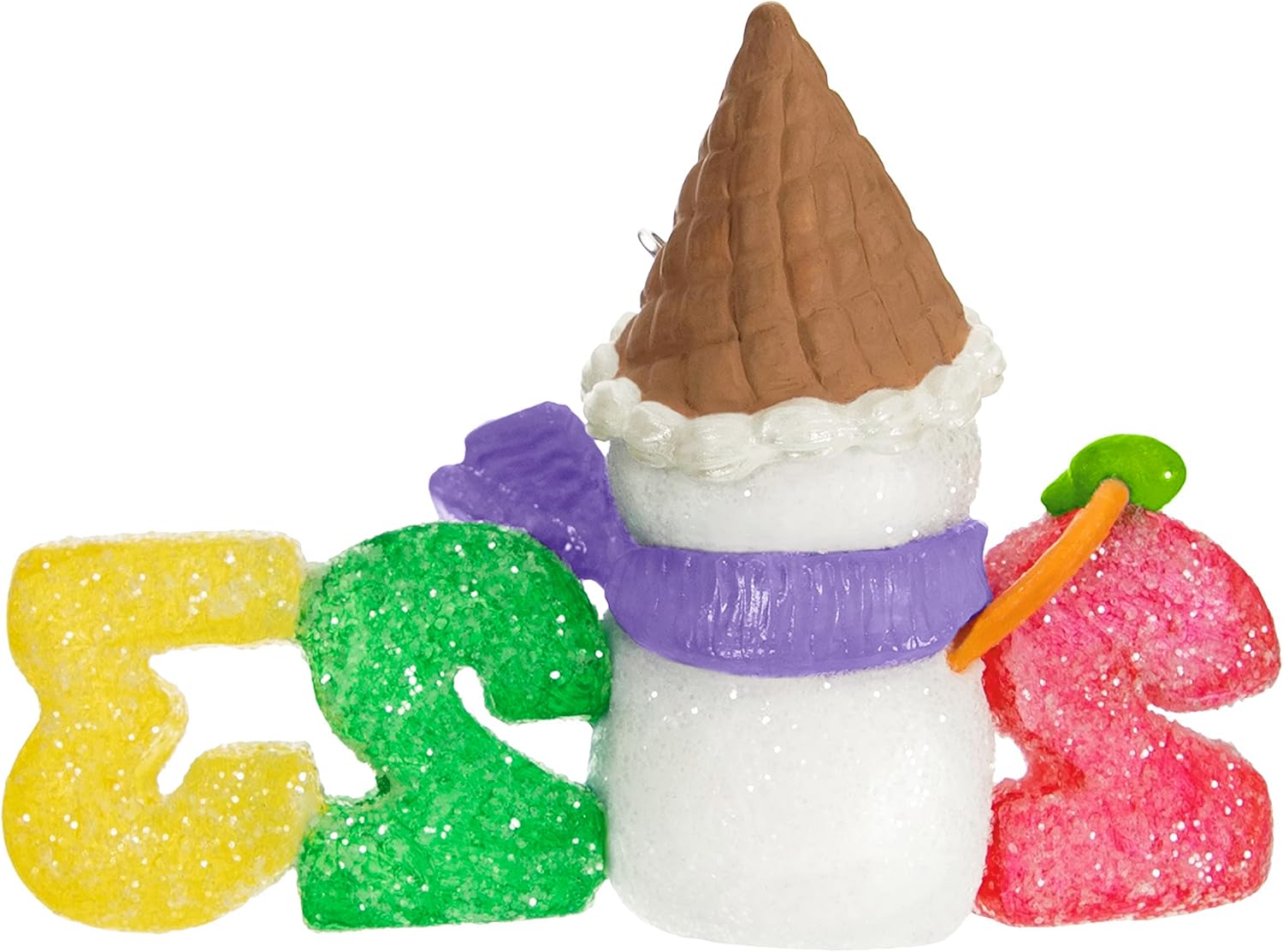 Celebrate the year 2023 with a sprinkle of sweetness! This 2023 Sweet Decade #4 Keepsake ornament features a glitter-trimmed snowman holding an ice cream cone (replacing the “0” in “2023”), surrounded by candy-gumdrop style numbers. Designed by artist Tammy Haddix, the ornament is made of durable plastic, includes its original 2023 Keepsake gift box, and comes dated and tagged for easy gifting or collecting.