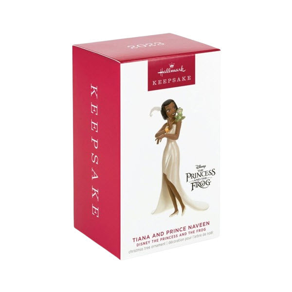 Dreams really can come true with the enchanting 2023 Tiana and Prince Naveen Keepsake ornament. This gracefully sculpted piece captures Tiana in her shimmering white gown, with Prince Naveen—transformed into a frog—perched upon her shoulder, symbolizing hope, transformation, and true love. Designed by Joanne Wright and crafted from high-quality lead‑free plastic, this piece arrives elegantly boxed and ready to hang—no additional setup needed. A charming nod to the determination and magic that define The Princess and the Frog.