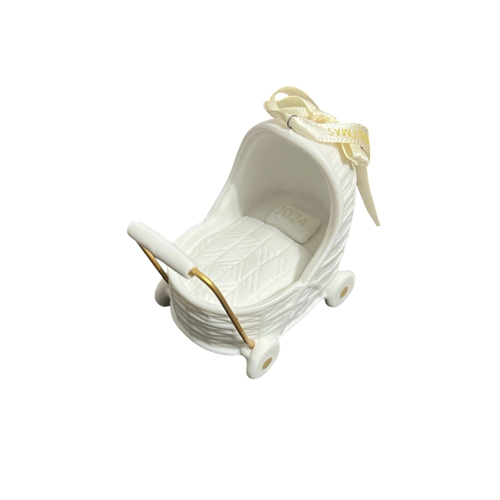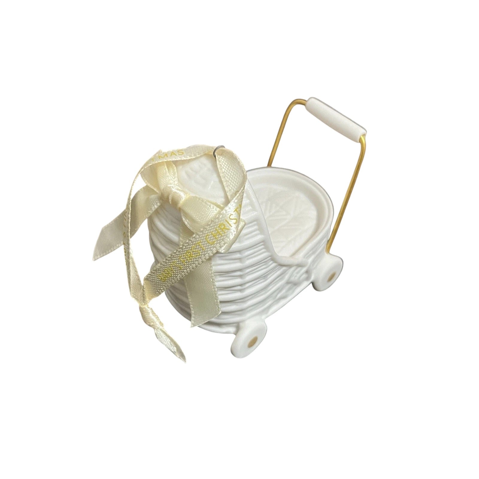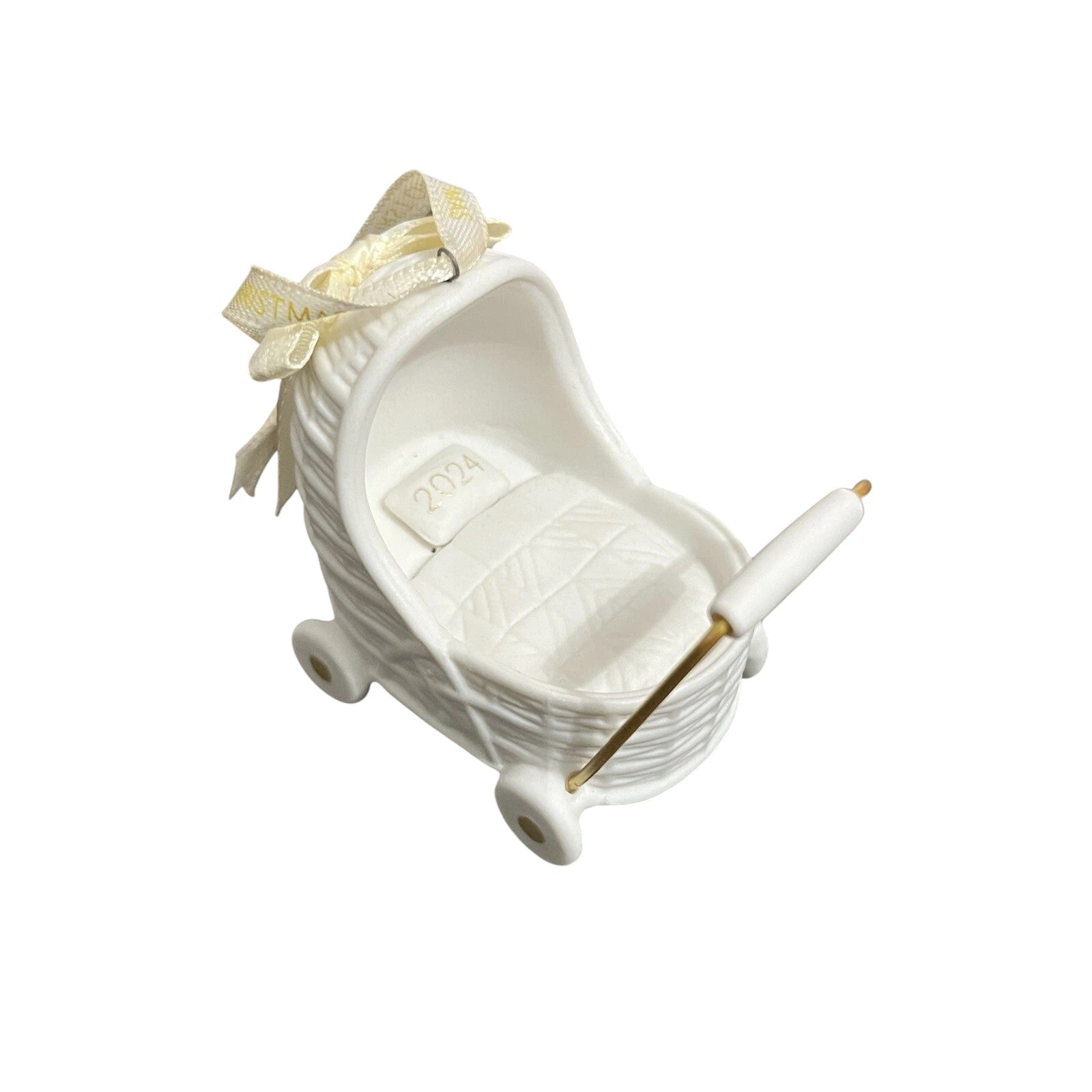 Celebrate the joy of your little one's inaugural holiday season with the 2024 Baby's First Christmas ornament (QHX3104). This elegant porcelain pram ornament is adorned with metallic gold accents and a delicate ribbon bow, featuring the inscription "Baby's First Christmas. 2024" to commemorate this special milestone. Crafted by artists Terri Steiger and Sheyda Abvabi Best, it measures approximately 2.83" x 2.6" x 1.75" and comes in its original gift box, making it a perfect keepsake for years to come.