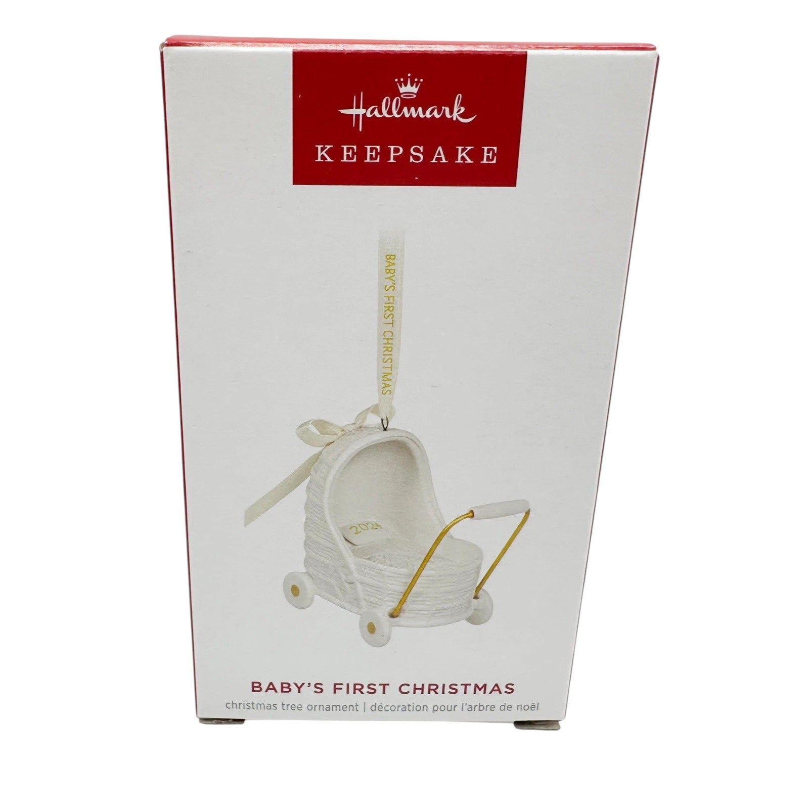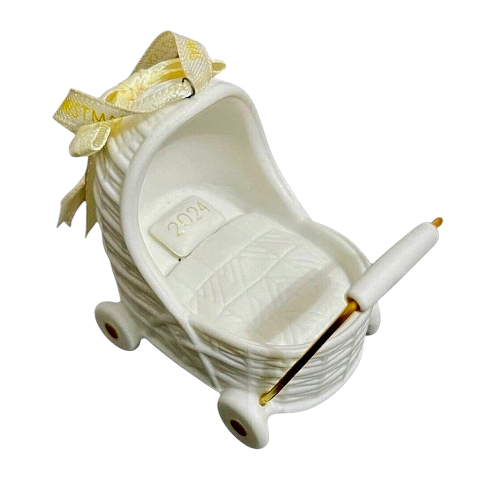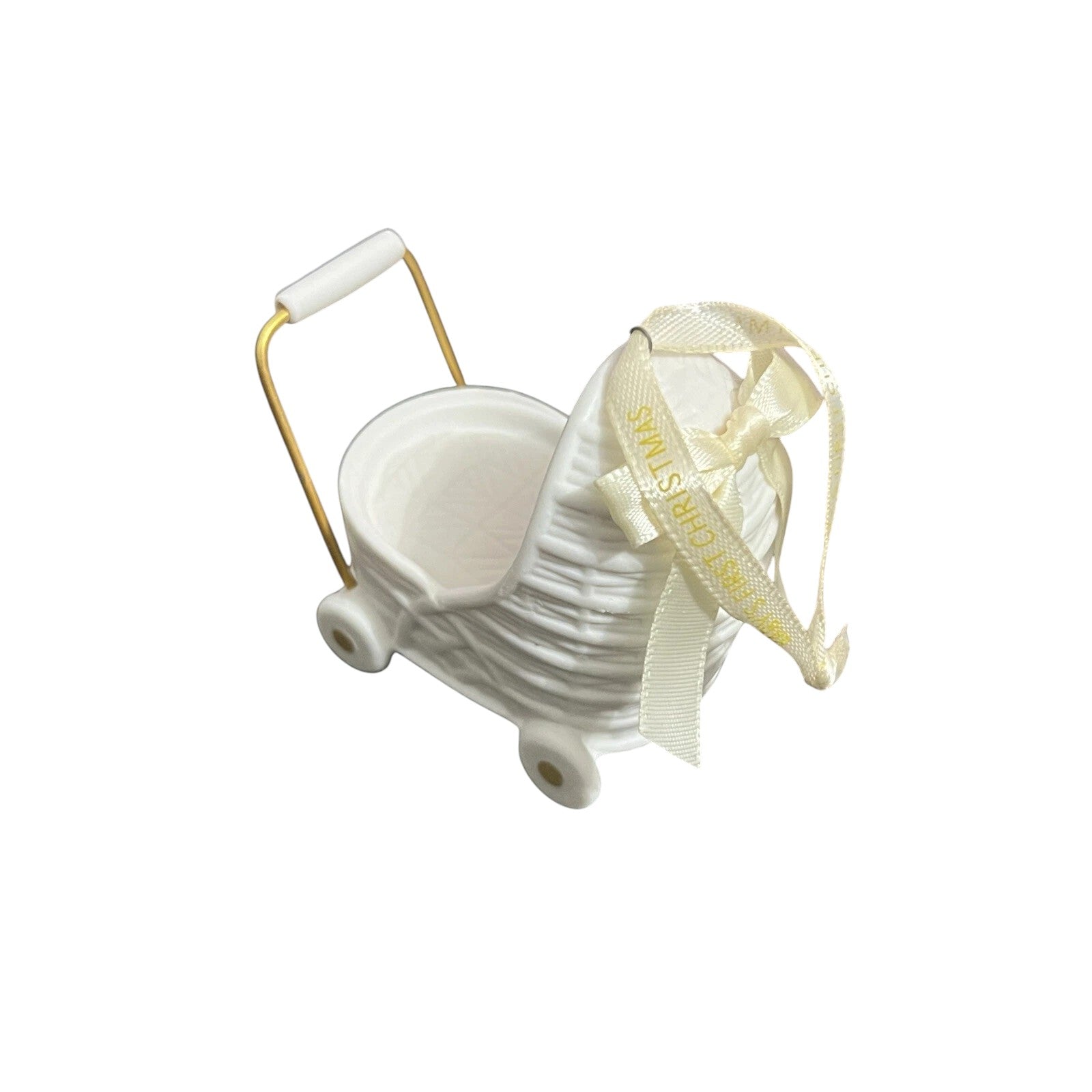 Celebrate the joy of your little one's inaugural holiday season with the 2024 Baby's First Christmas ornament (QHX3104). This elegant porcelain pram ornament is adorned with metallic gold accents and a delicate ribbon bow, featuring the inscription "Baby's First Christmas. 2024" to commemorate this special milestone. Crafted by artists Terri Steiger and Sheyda Abvabi Best, it measures approximately 2.83" x 2.6" x 1.75" and comes in its original gift box, making it a perfect keepsake for years to come.