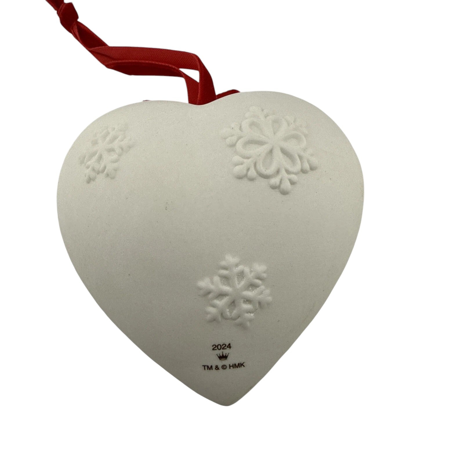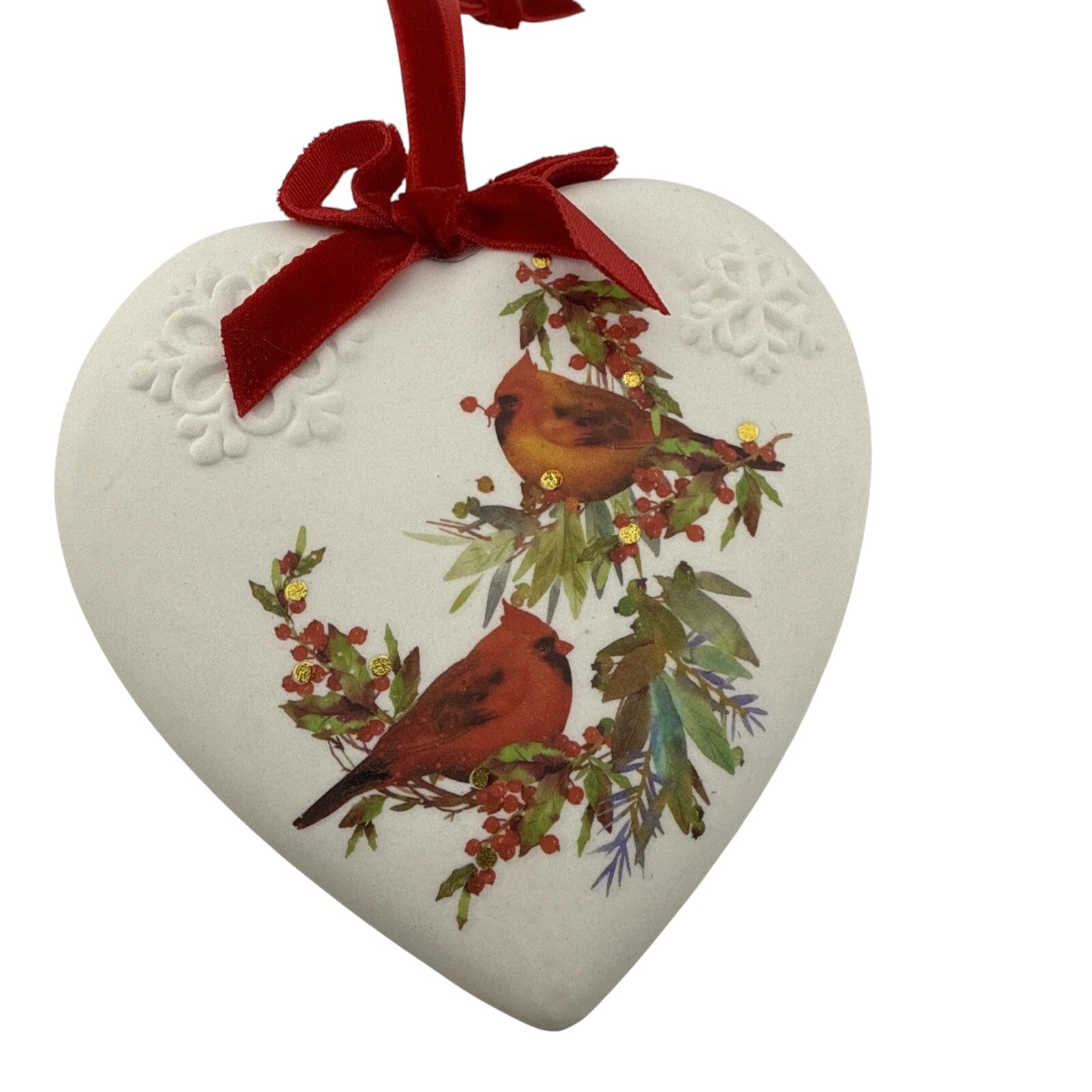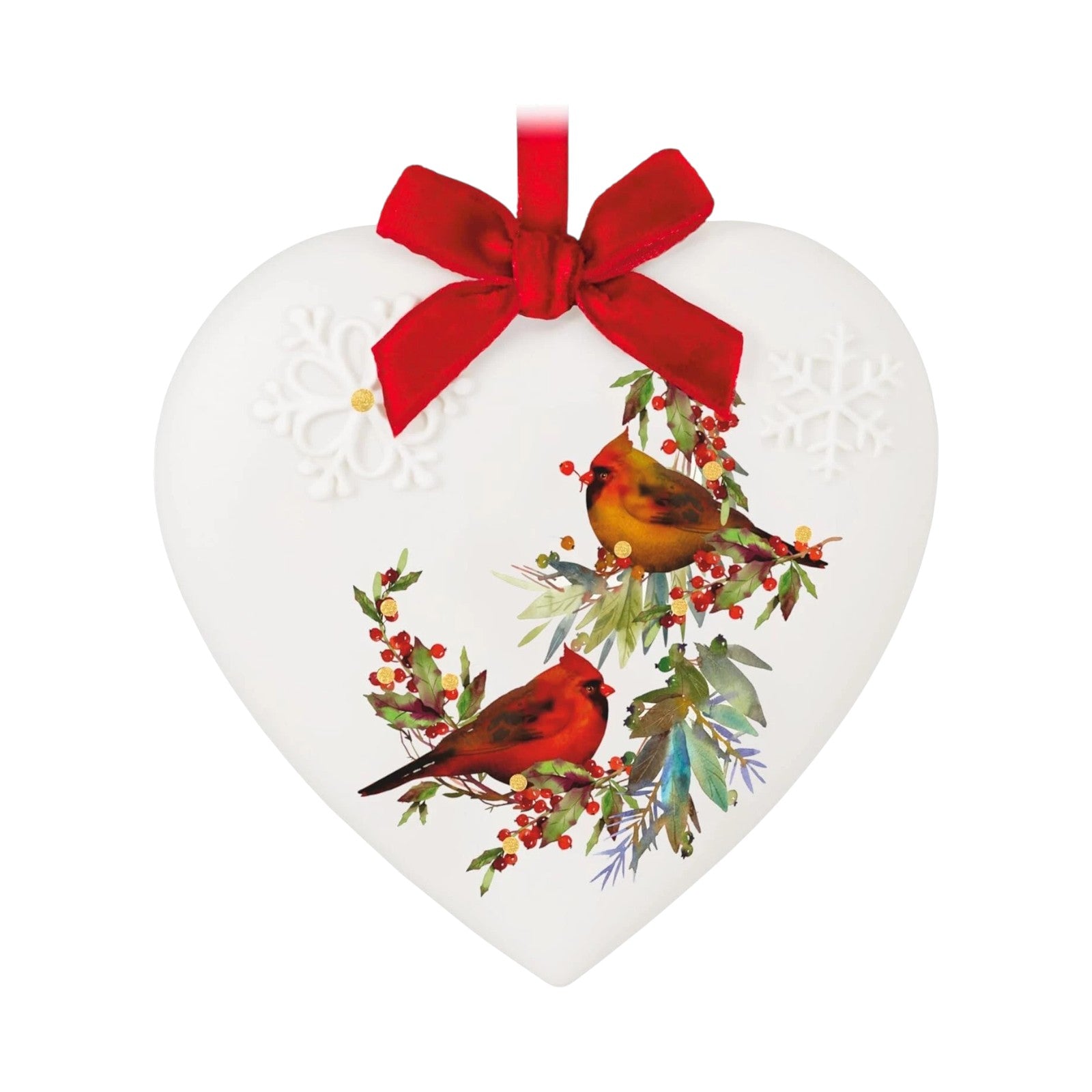Embrace the serene beauty of winter with the 2024 Christmas Cardinals ornament. This elegant porcelain heart-shaped ornament features two cardinals perched on holly branches, surrounded by embossed snowflakes and glittery accents. A festive red ribbon bow completes the design, adding a touch of holiday cheer, this ornament is a perfect addition to your Christmas tree or a thoughtful gift for bird enthusiasts.