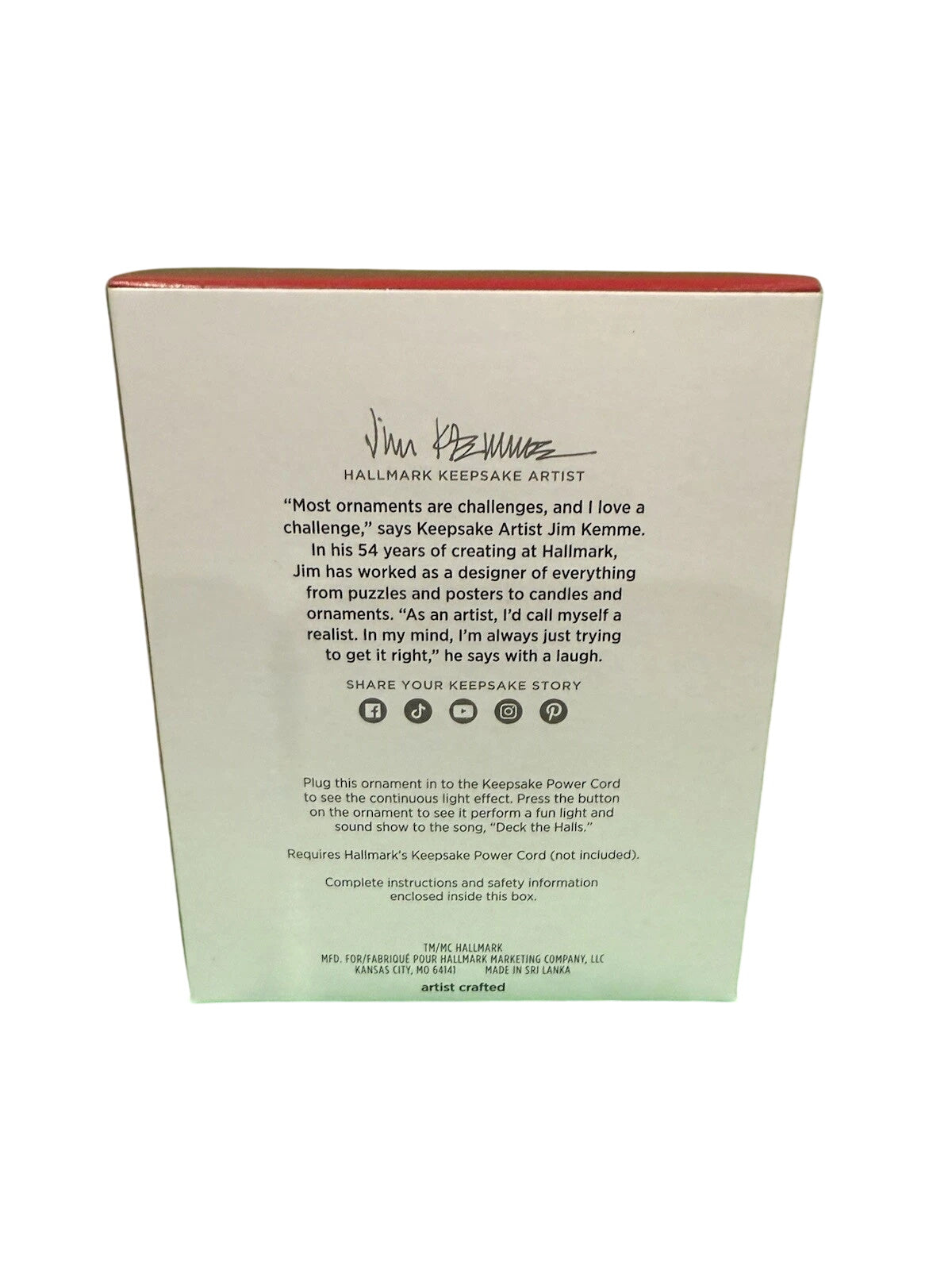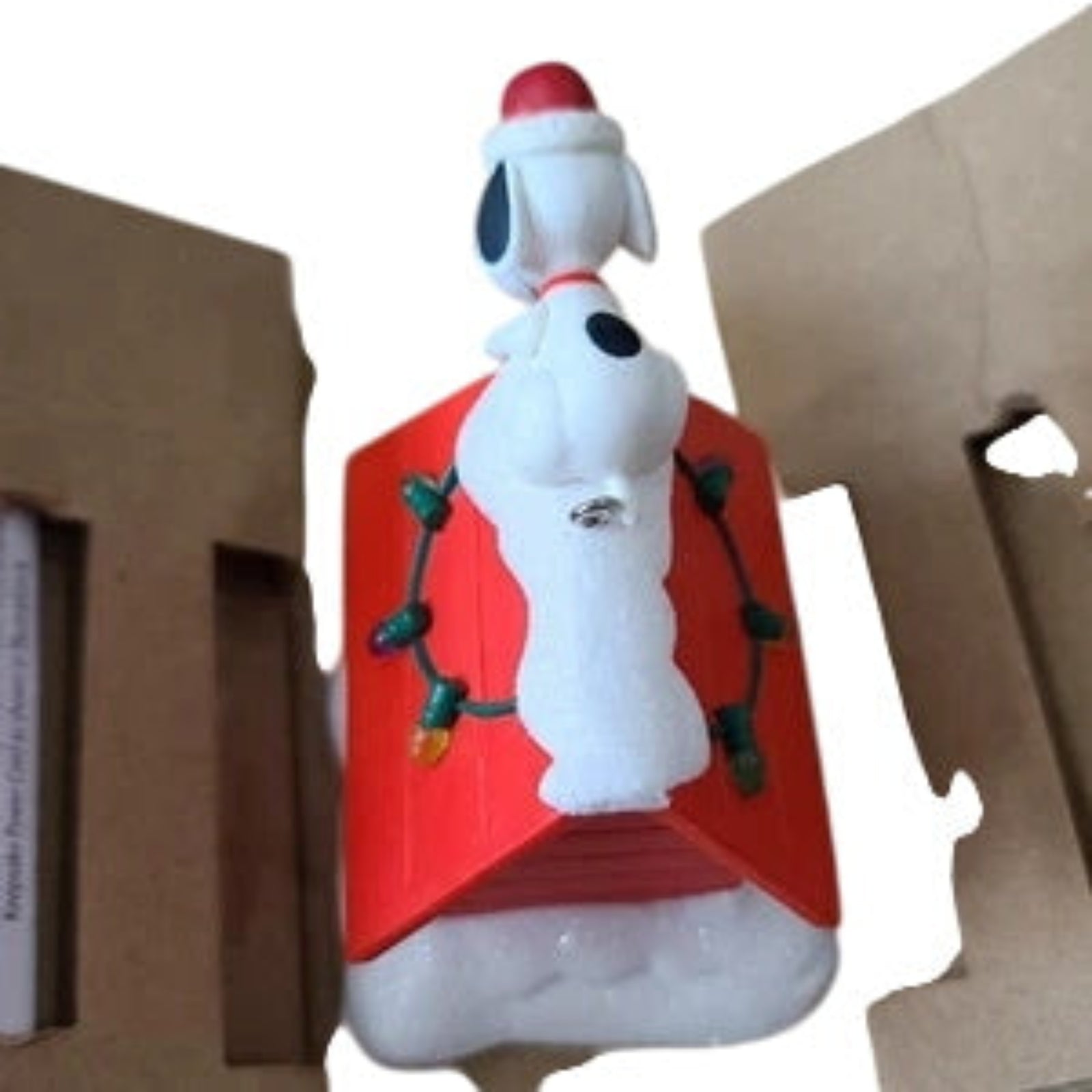 Everyone’s favorite beagle, Snoopy, is back—this time celebrating Christmas atop his iconic red doghouse adorned with glittery snow and festive string lights, while Woodstock helps deck a miniature tree below. A button triggers a cheerful light-and-sound show, complete with “Deck the Halls”—no batteries needed, just plug into Hallmark’s Keepsake Power Cord (sold separately). Arrives mint-in-box with original tags, ready to brighten your holiday décor.