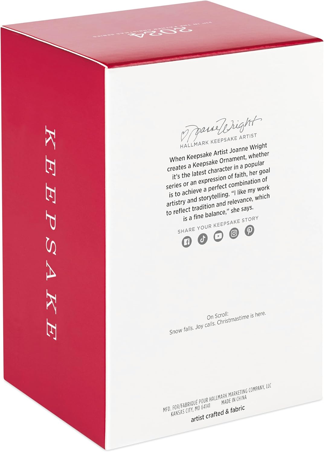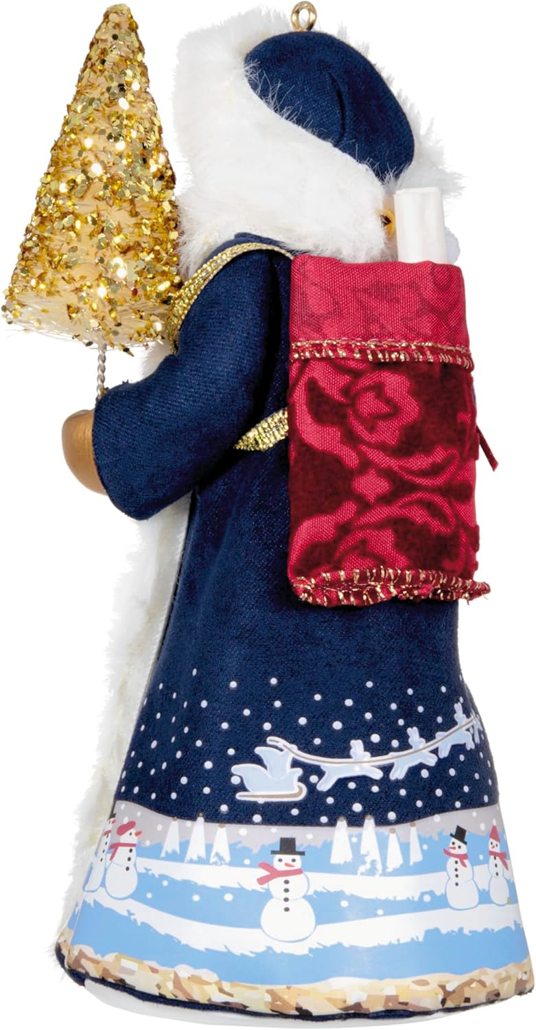 Celebrate the 21st edition of Hallmark's cherished Father Christmas series with the 2024 ornament. This exquisite piece features Santa Claus adorned in a navy blue coat with faux-fur trim, holding a glistening gold tree in one hand and a tiny snowman in the other. The coat's intricate embroidery depicts a serene winter scene, enhanced by woven fabric, metallic threads, and glitter accents. A scroll in his pack bears the heartfelt message; "Snow falls. Joy calls. Christmastime is here."